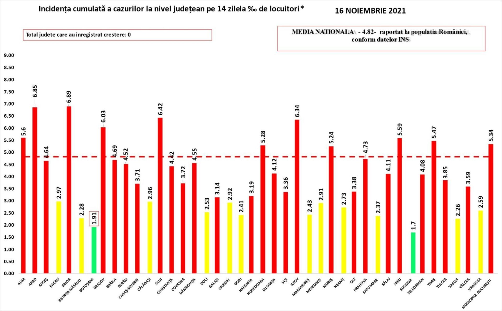 În intervalul 15-16 noiembrie în spitalele din județ au fost internate 17 persoane cu Covid și au fost externate 40 persoane. În aceeași perioadă de referință, în județ au decedat 6 persoane din cauza Covid.