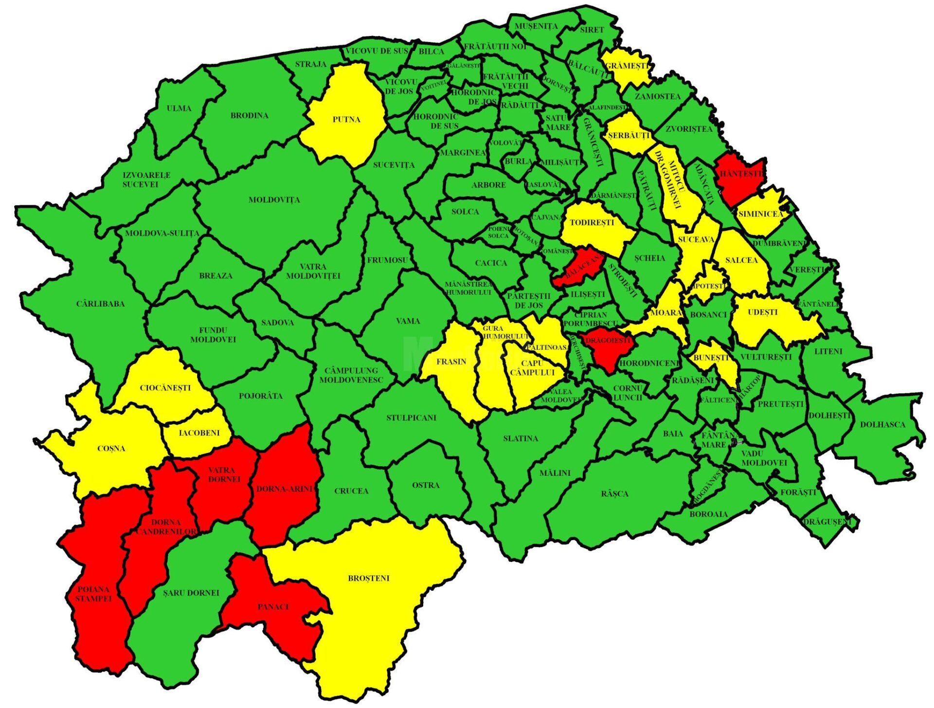 Conform distribuției cazurilor Covid-19 pe unități administrativ-teritoriale, din cele 114 localități, 4 nu au nici un caz activ, 9 au câte un caz în evoluție, 45 au sub cinci cazuri în evoluție, 29 au sub zece cazuri în evoluție, iar 27 au peste zece cazuri în evoluție.