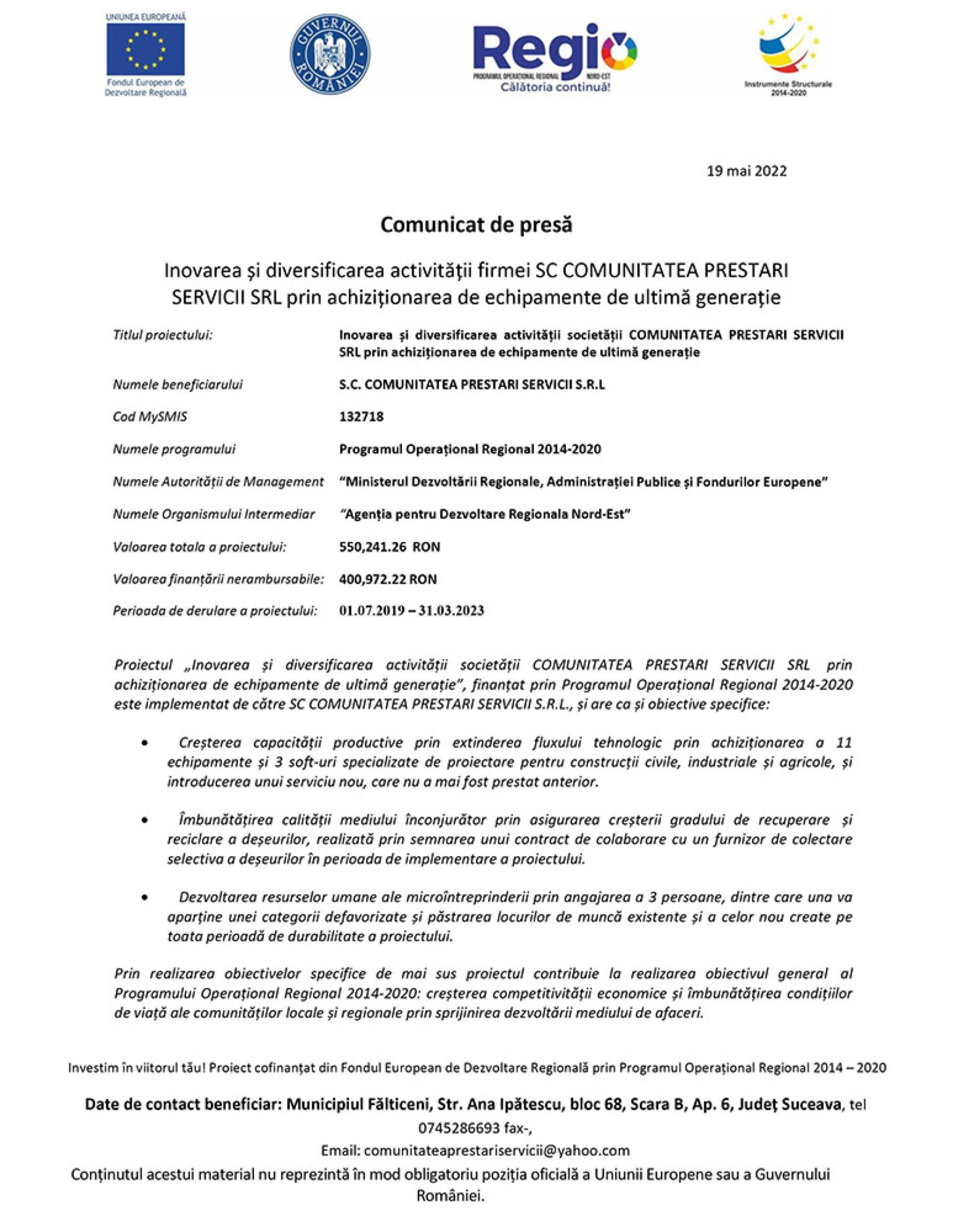Titlul proiectului: Inovarea și diversificarea activității societății COMUNITATEA PRESTARI SERVICII SRL prin achiziționarea de echipamente de ultimă generație