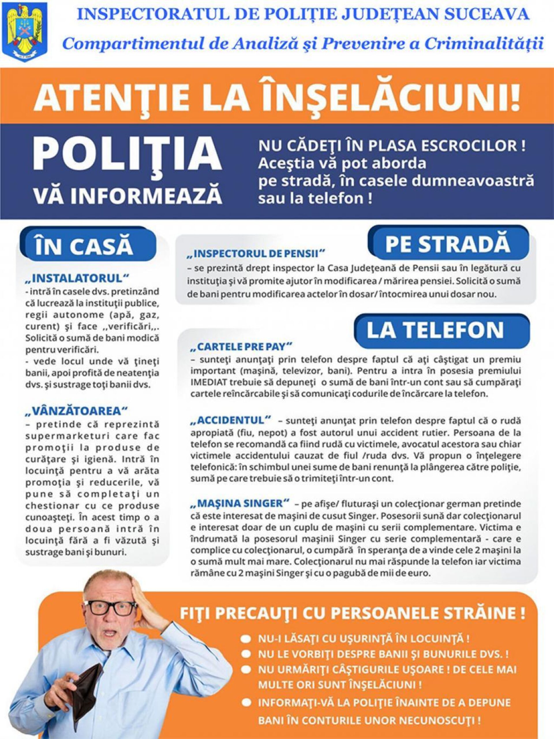 Multitudinea de înșelăciuni în moduri diverse de operare a infractorilor, petrecute în ultima perioadă în județ, a determinat lansarea de către polițiști a unui program de prevenire a acestora. Prevenirea acestor fapte de înșelăciune a devenit o prioritate, după ce modalitățile prin care oamenii sunt înșelați s-au înmulțit în ultima perioadă, creând pagube importante în buzunarele celor creduli. În acest sens polițiștii au distribuit peste 300 de ghiduri cu recomandări pentru prevenirea înșelăciunilor prin diverse moduri de operare.