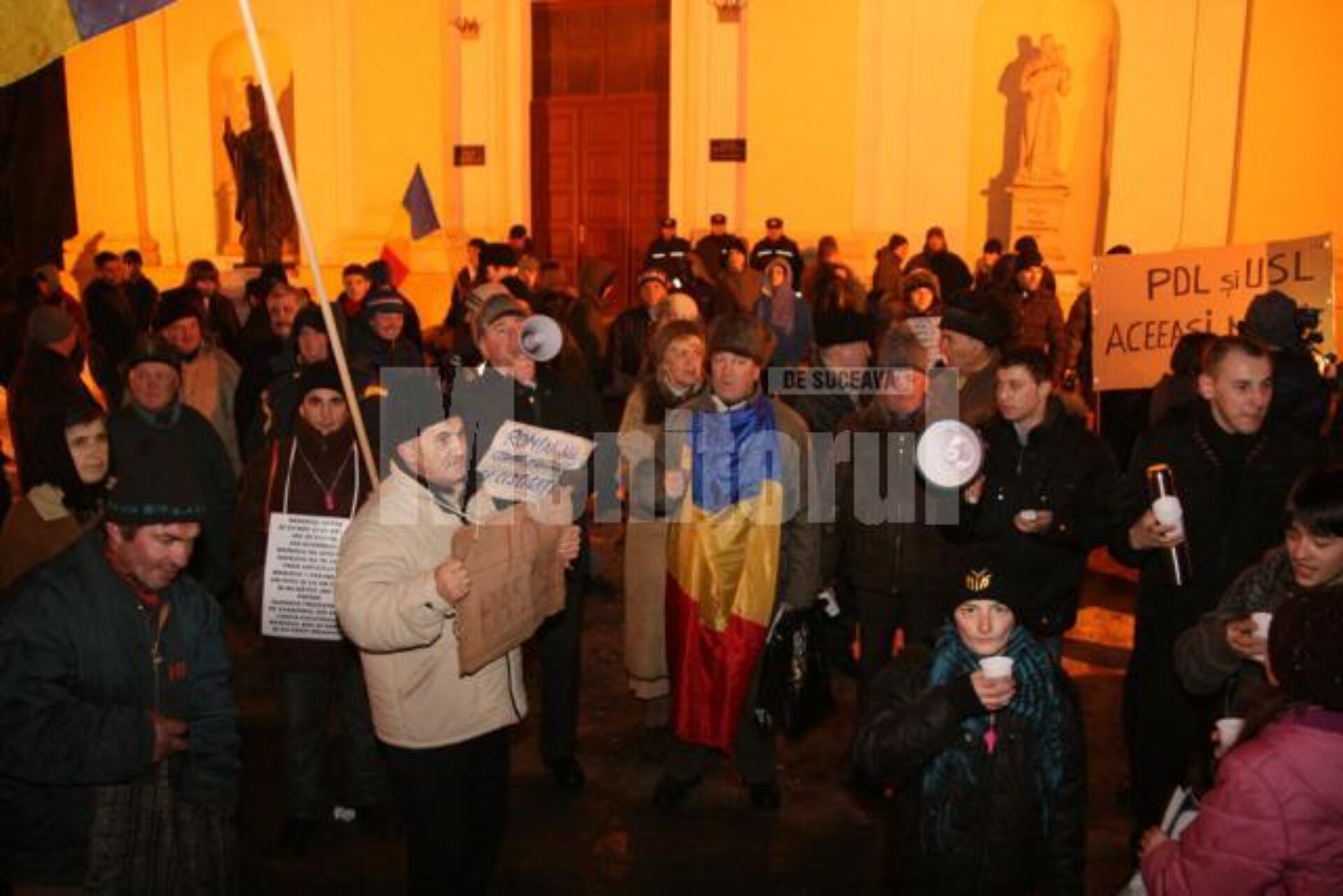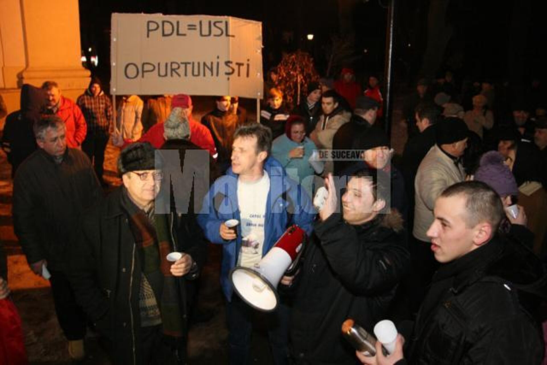 Seara de ieri a adus elemente noi la protestul din fața Prefecturii Suceava. Un grup de aproximativ zece persoane, venit cu pancarte pe care se putea citi „PD-L=USL=Opurtuniști” sau „PD-L și USL, aceeași mizerie” a fost luat în colimator de restul participanților la protest, în număr de circa 120 de persoane.