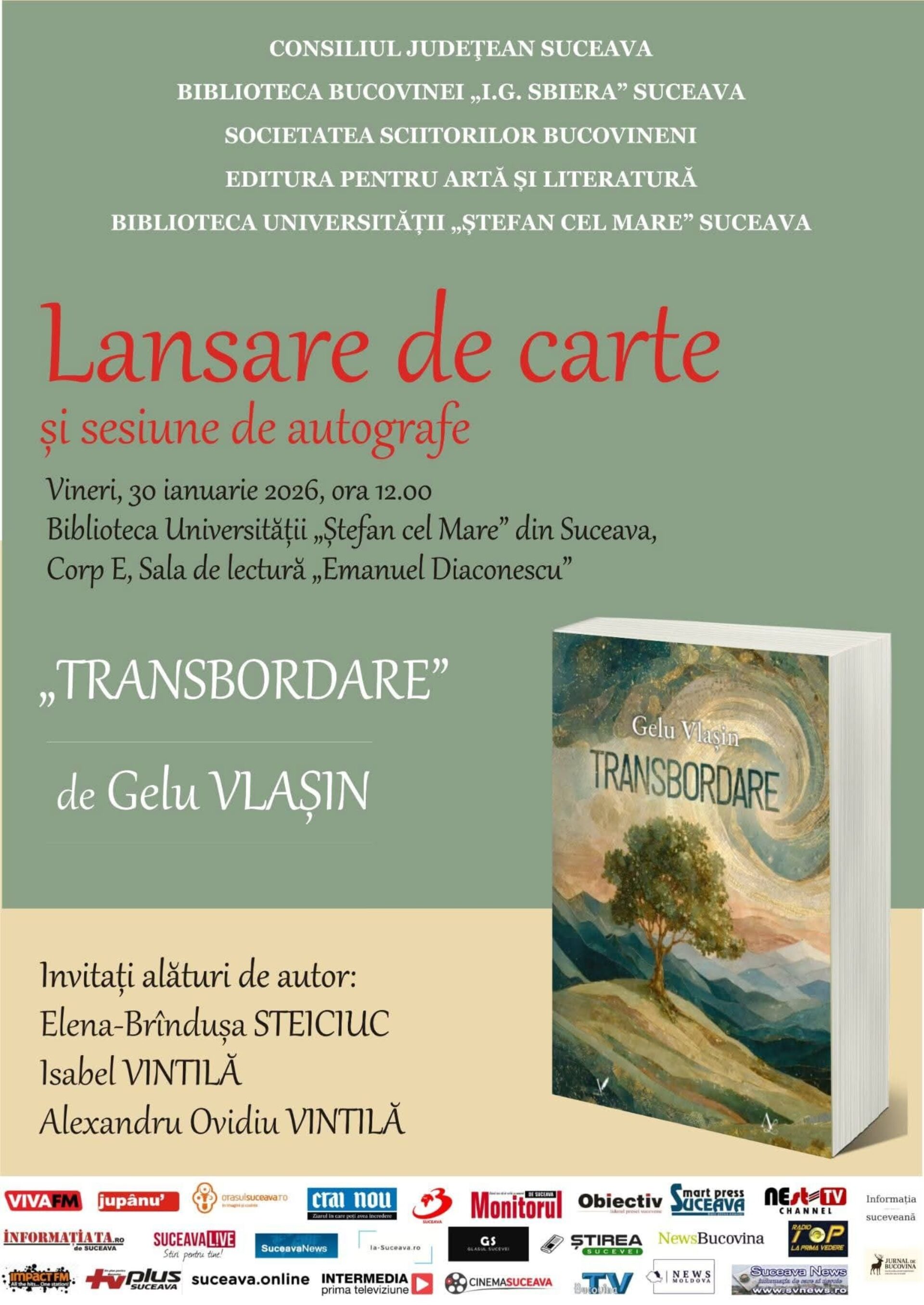Joi, 30 ianuarie 2026, în Sala de lectură „Emanuel Diaconescu” a Bibliotecii Universității „Ștefan cel Mare” din Suceava, a avut loc lansarea romanului „Transbordare”, semnat de scriitorul bistrițean Gelu Vlaşin, unul dintre autorii remarcabili ai generației anilor 2000.