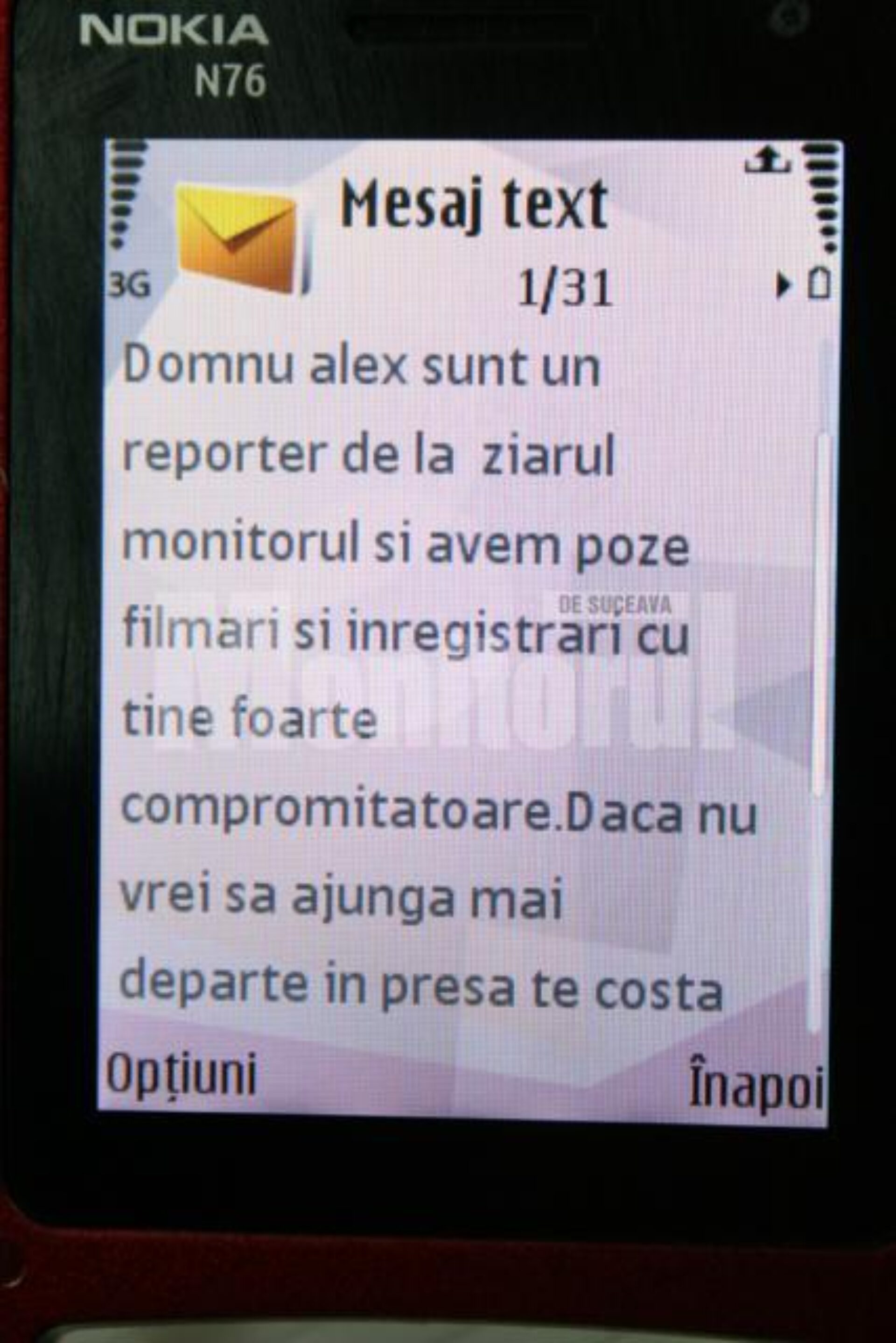 „Domnu Alex, sunt un reporter de la ziarul Monitorul și avem poze și filmări cu tine foarte compromițătoare. Dacă nu vrei să ajungă mai departe în presă te costă o cartelă orange și îmi dai codul prin sms acum, dacă nu, ajunge mai departe în presă”.