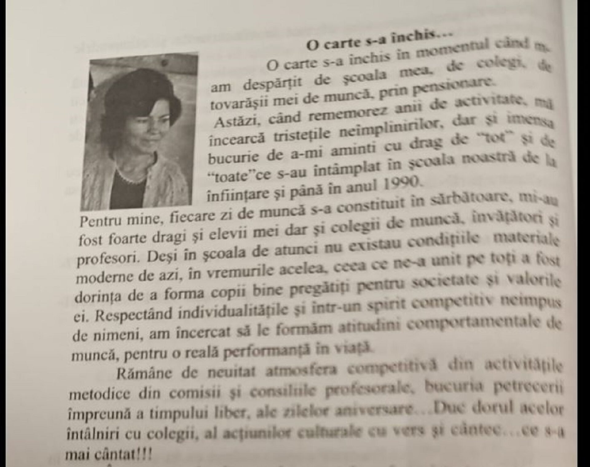 Deși în școala de atunci nu existau condițiile materiale moderne de azi, în vremurile acelea, ceea ce ne-a unit pe toți a fost dorința de a forma copii bine pregătiți pentru societate și valorile ei. Respectând individualitățile și într-un spirit competitiv neimpus de nimeni, am încercat să le formăm atitudini comportamentale de muncă, pentru o reală performanță în viață.
