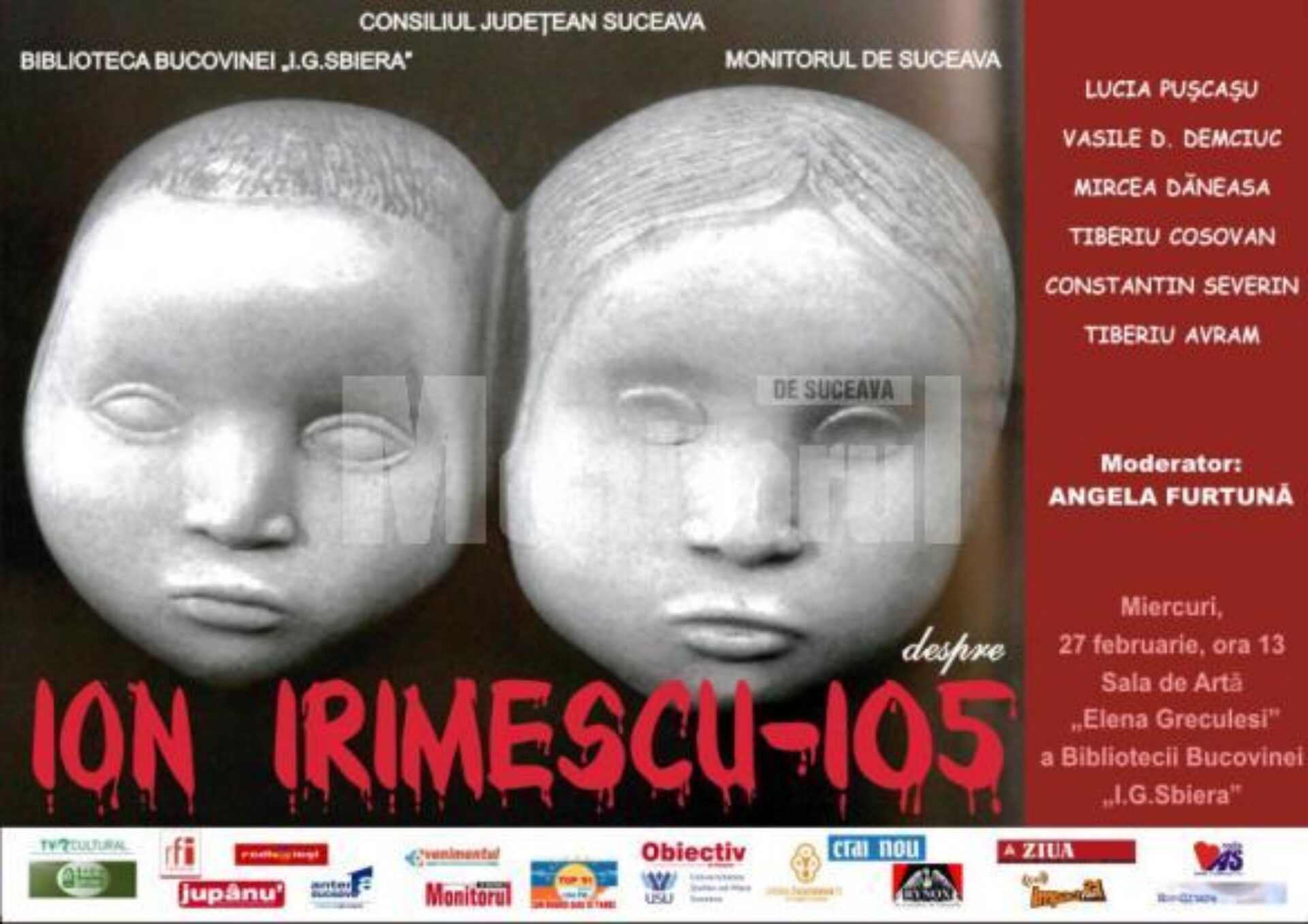 La ora 13:00, în Sala de Arte „Elena Greculesi” a Bibliotecii Bucovinei „I.G. Sbiera”, se va desfășura un moment evocator cu genericul „Ion Irimescu – 105”, al cărui inițiator și moderator este scriitoarea Angela Furtună, la care invitați la o întâlnire interactivă cu publicul sunt sculptorul și pictorul Mircea Dăneasa, universitarul Vasile M. Demciuc, artista plastică Lucia Pușcașu, jurnaliștii Tiberiu Avram, redactorul șef al „Monitorului de Suceava”, și subsemnatul.
