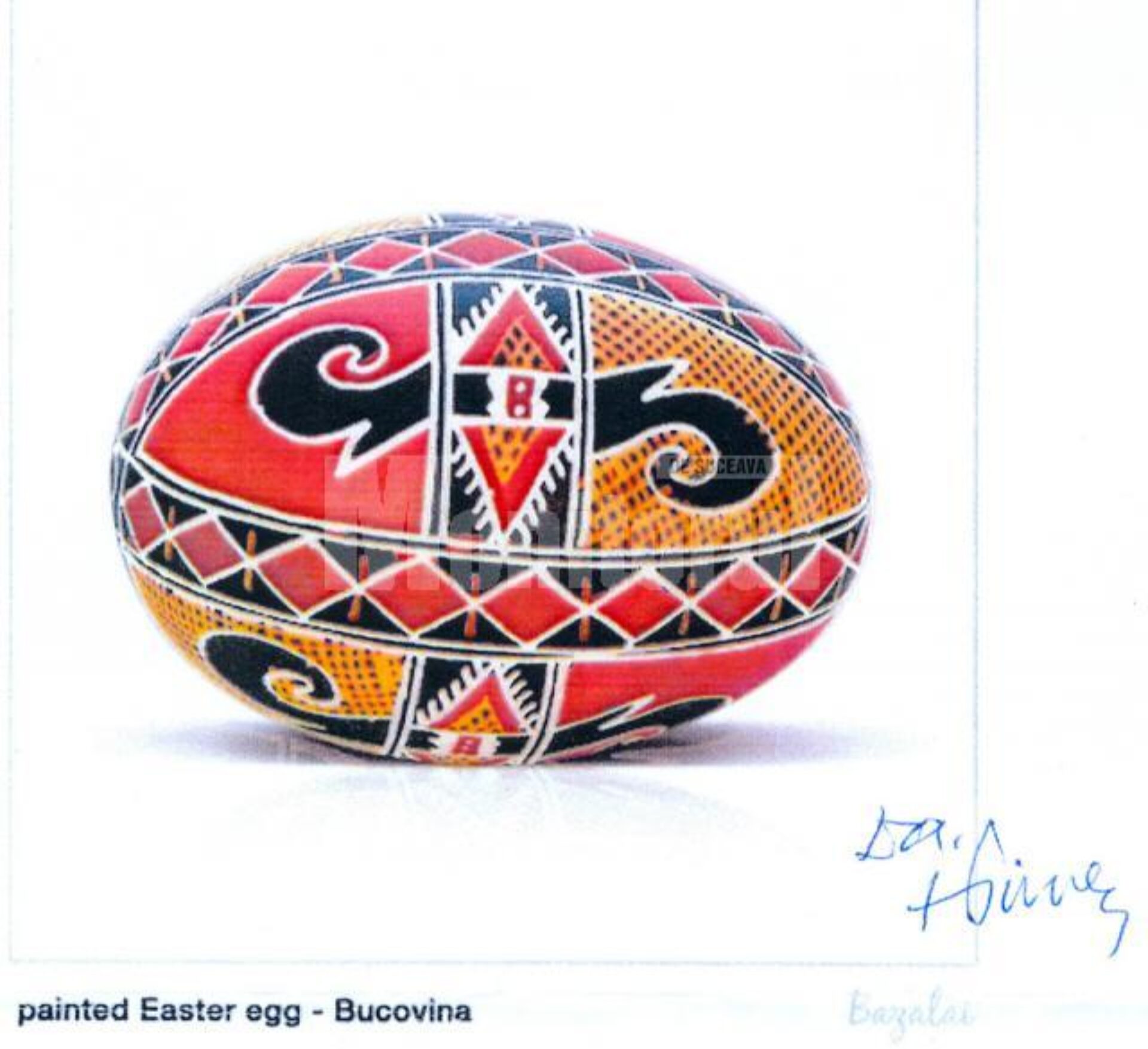 Oul uriaș care va fi amplasat în centrul municipiului Suceava a primit acceptul ÎPS Pimen, arhiepiscopul Sucevei și Rădăuților. Primarul Ion Lungu a prezentat, ieri, într-o conferință de presă, imaginea oului, cu binecuvântarea sub formă de semnătură a înaltului ierarh. Oul, realizat din fibră de sticlă, acoperit cu o folie autocolantă cu modele tradiționale bucovinene și purtând semnul crucii, costă 10.000 de euro și va fi construit de o firmă din Buzău. „Ne dorim un ou frumos, reprezentativ. Am stabilit modelul în roșu și negru, cu modele tradiționale și cu semnul crucii”, a declarat primarul de Suceava, Ion Lungu.