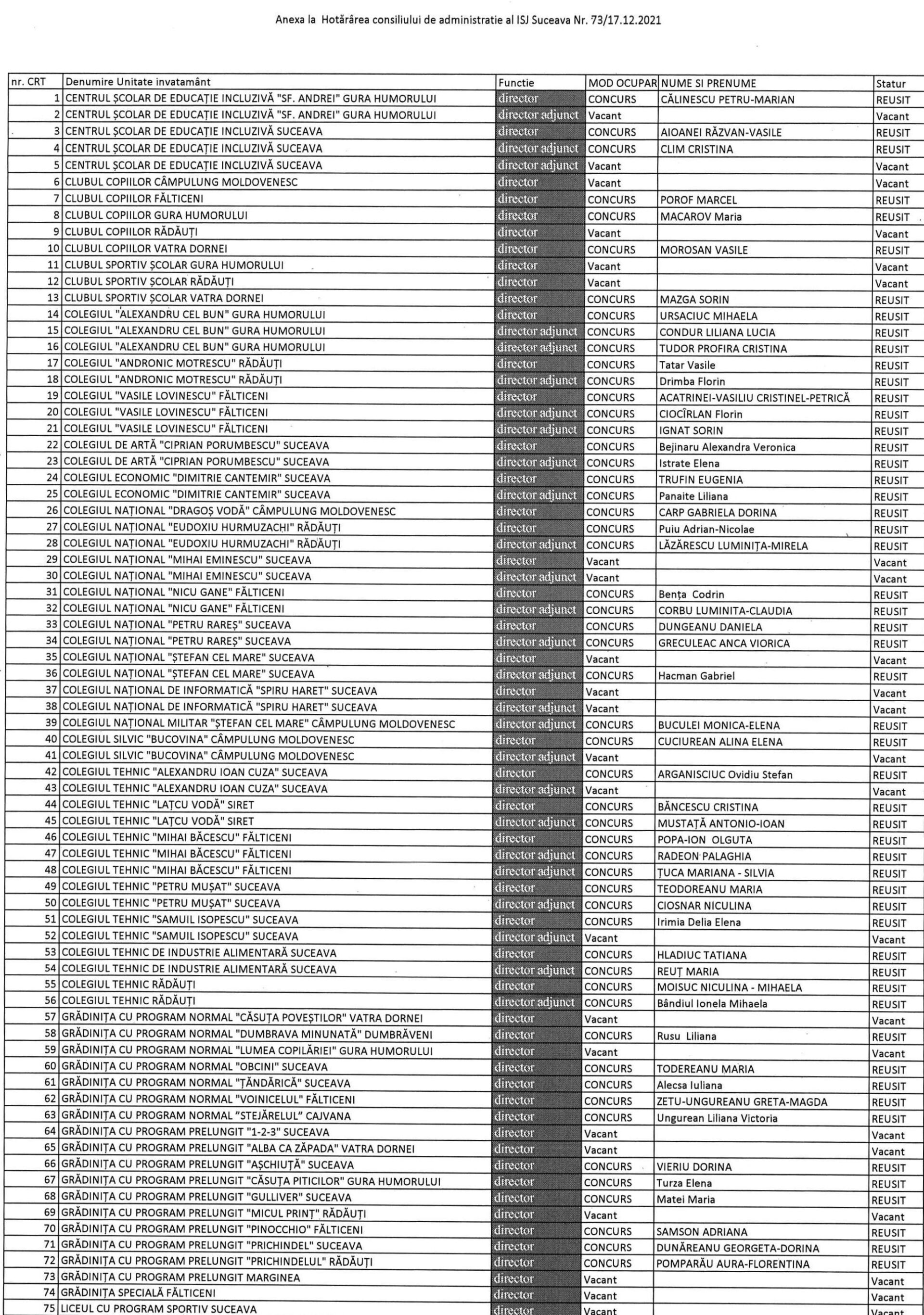Consiliul de administrație al Inspectoratului Școlar Județean (IȘJ) Suceava, întrunit în ședința din 17 decembrie 2021, a validat rezultatele finale ale Concursului național pentru ocuparea funcțiilor de director și director adjunct din unitățile de învățământ de stat, sesiunea 2021. Tabelul cu toate școlile și numele noilor directori și directori adjuncți a fost publicat pe site-ul IȘJ Suceava, urmând ca numirile în funcție să aibă loc începând cu 10 ianuarie 2022, debutul semestrului al doilea al anului școlar 2021-2022.