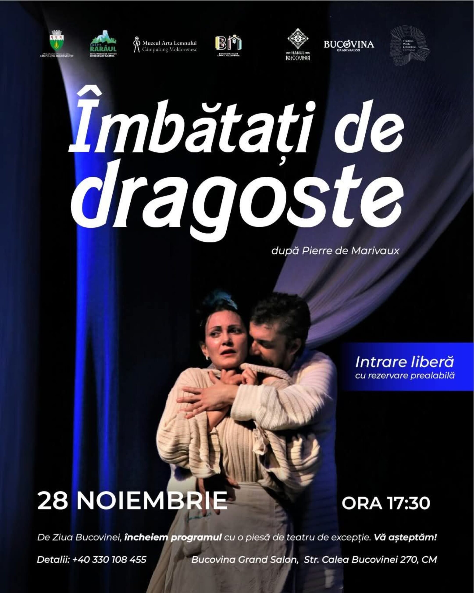 „Pentru că acest moment istoric merită să fie marcat printr-o seară culturală cu adevărat specială, vă așteptăm cu drag la piesa <Îmbătați de dragoste>, în interpretarea actorilor de la Teatrul <Mihai Eminescu> Botoșani. Este o piesă de suflet, plină de emoție, umor și întrebări care ating inima și care ne reamintesc că dragostea nu ține cont de reguli”, au transmis organizatorii. Intrarea la teatru este liberă, însă cu rezervare prealabilă, care se poate face accesând linkul: https://hanulbucovinei.ro/teatru-la-bucovina-grand-salon/