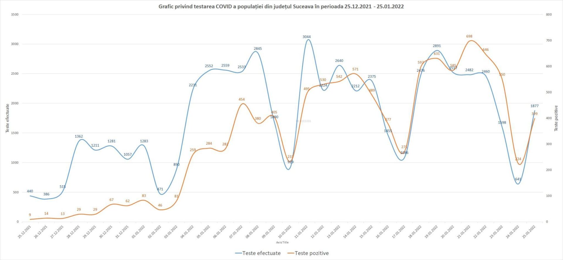 Numărul de cazuri noi de infectare cu SARS-CoV-2 confirmate în județul Suceava a scăzut, marți, la 399 de persoane confirmate/ zi, din 1.877 de persoane testate și a scăzut, de asemenea, indicele de pozitivare, de la aproape 35 la sută, înregistrat în zilele anterioare, la 21,26 la sută marți. Incidența la nivel județean este de 9,17 la mie, cu 4.978 de cazuri în evoluție.