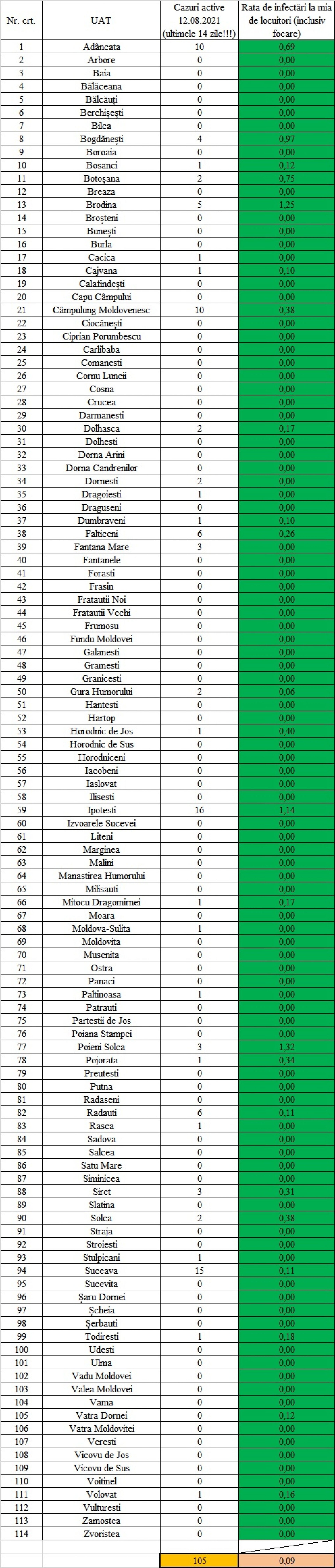 Comuna Ipotești a depășit municipiul Suceava la numărul de cazuri active, cu 16 persoane cu Covid în evoluție, față de municipiul reședință de județ, unde sunt 15 cazuri în evoluție. Un număr mai mare de cazuri active se mai înregistrează în Adâncata – 10 cazuri și Câmpulung Moldovenesc – 10 cazuri. În total, în județ sunt la această dată 105 cazuri active și o incidență de 0,09.