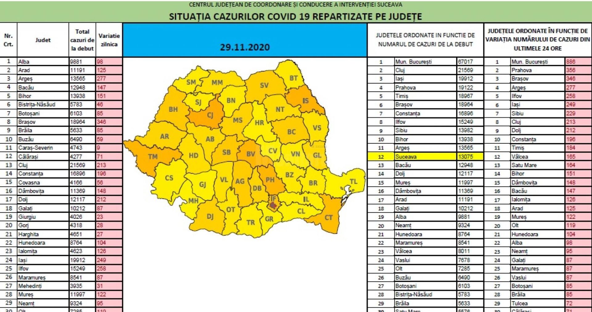 Județul Suceava a coborât pe locul 12 la nivel național la numărul total de îmbolnăviri cu noul Covid-19 înregistrat de la începutul pandemiei și până în prezent. Dacă în data de 12 noiembrie 2020 județul Suceava se afla pe locul 7 la nivel național, cu 10.980 de cazuri totale, în momentul de față a mai coborât cinci locuri, înregistrând un număr total de 13.075 de îmbolnăviri. În fața Sucevei se află municipiul București și județene Cluj, Iași, Prahova, Timiș, Brașov, Constanța, Ilfov, Sibiu, Bihor și Argeș. De asemenea, la numărul de cazuri înregistrate de sâmbătă până luni, județul Suceava s-a aflat pe locul 32 la nivel național, cu 63 de îmbolnăviri.