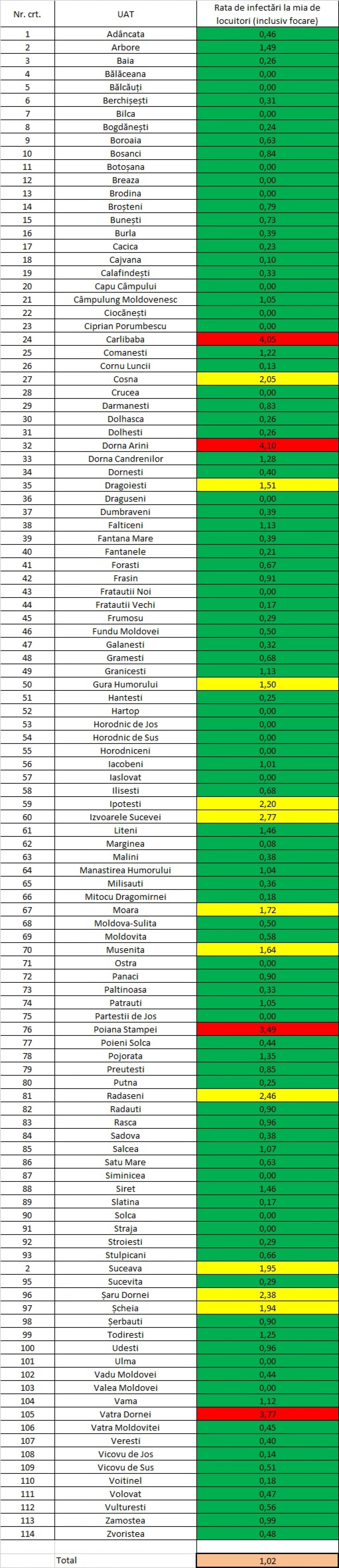 Numărul cazurilor de Covid-19 în evoluție în județul Suceava a scăzut din nou sub 800, după două zile în care a depășit această cifră. Vineri, Prefectura Suceava a informat că sunt 790 de cazuri în evoluție și, din cele 114 localități, 24 nu au niciun caz de infecție Covid-19 în evoluție. Alte 25 au câte un caz, 34 au sub cinci cazuri, 15 au sub zece cazuri, iar 16 au peste zece cazuri în evoluție. În municipiul Suceava incidența cazurilor pozitive este de 1,95 la mie.