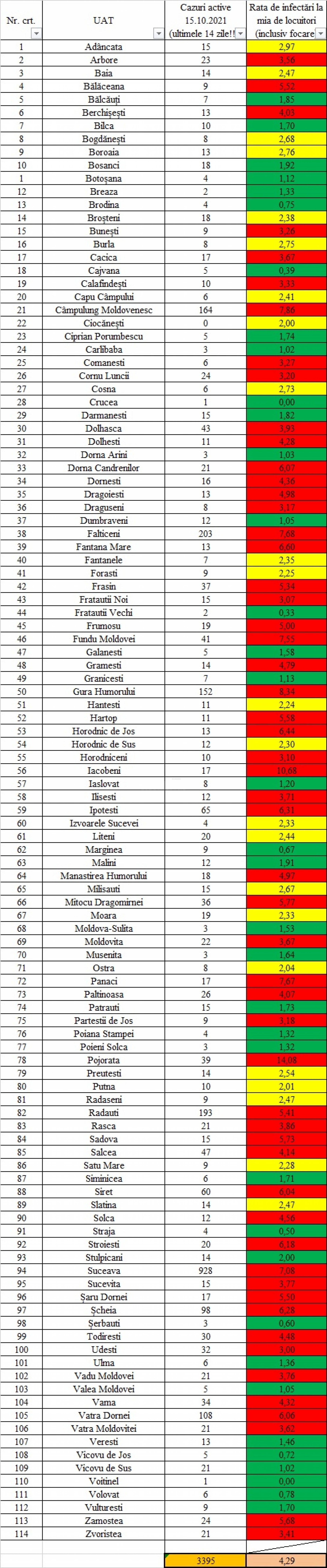 Conform distribuției cazurilor Covid-19 pe unități administrativ-teritoriale, din cele 114 localități, una nu are niciun caz în evoluție, două au câte un caz în evoluție, 13 au sub cinci cazuri în evoluție, 27 au sub zece cazuri în evoluție, iar 71 au peste zece cazuri în evoluție. În total, în județul Suceava sunt acum 3.395 de cazuri de infecție Covid -19 în evoluție.