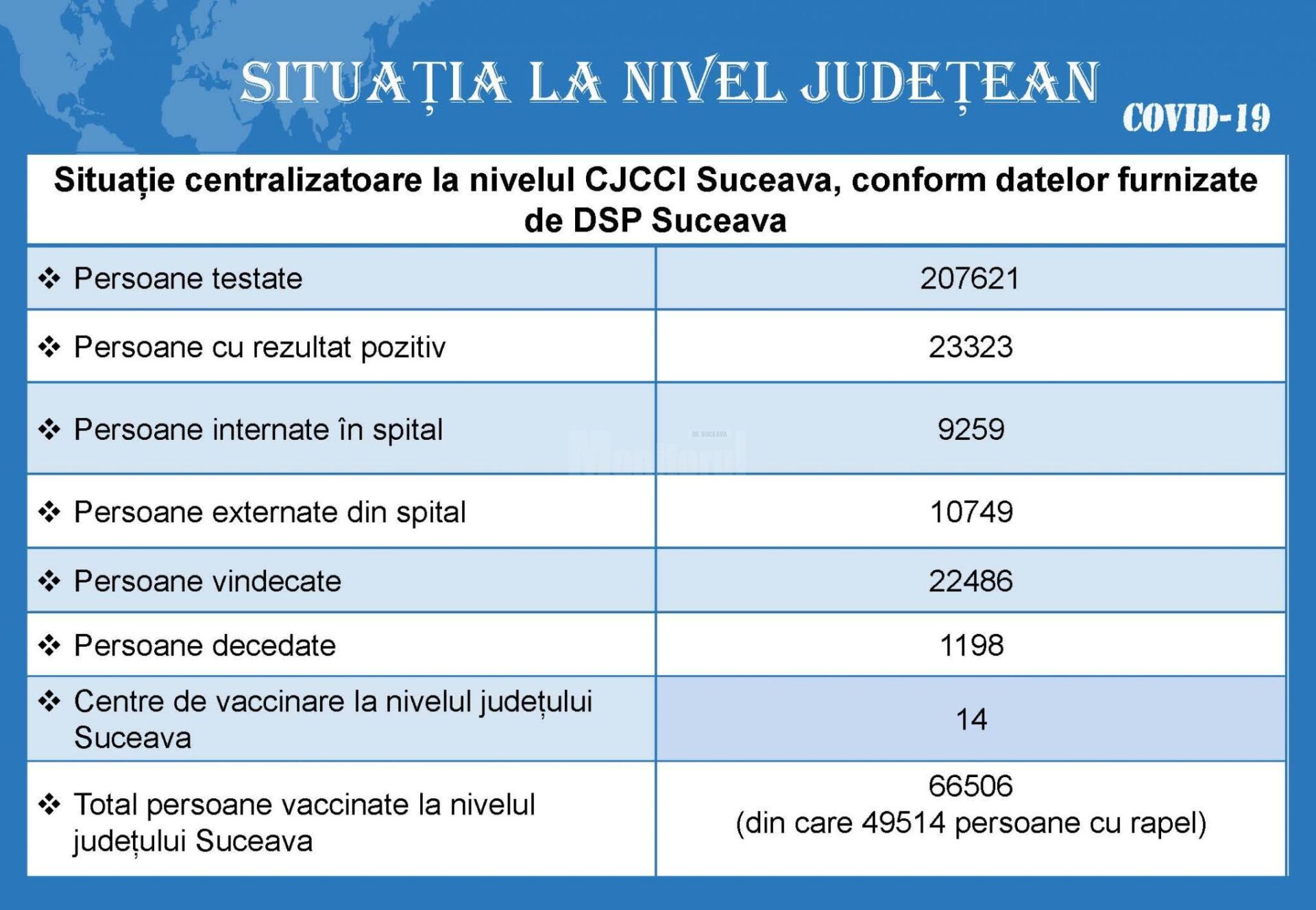 Din totalul celor 433 pacienți internați în Spitalul Județean de Urgență „Sf. Ioan cel Nou” Suceava, 70 sunt diagnosticați cu Covid-19, 11 pacienți sunt în zona tampon și 352 pacienți sunt cu alte afecțiuni (non-Covid). 20 de pacienți cu Covid prezintă forme severe și 14 au forme grave, fiind internați în secția ATI. Spitalul Suceava dispune, la această dată, de 449 paturi libere, din care 127 pentru pacienți Covid-19, 305 în sectorul non-Covid, 17 pentru zona tampon și 4 paturi la ATI Covid.