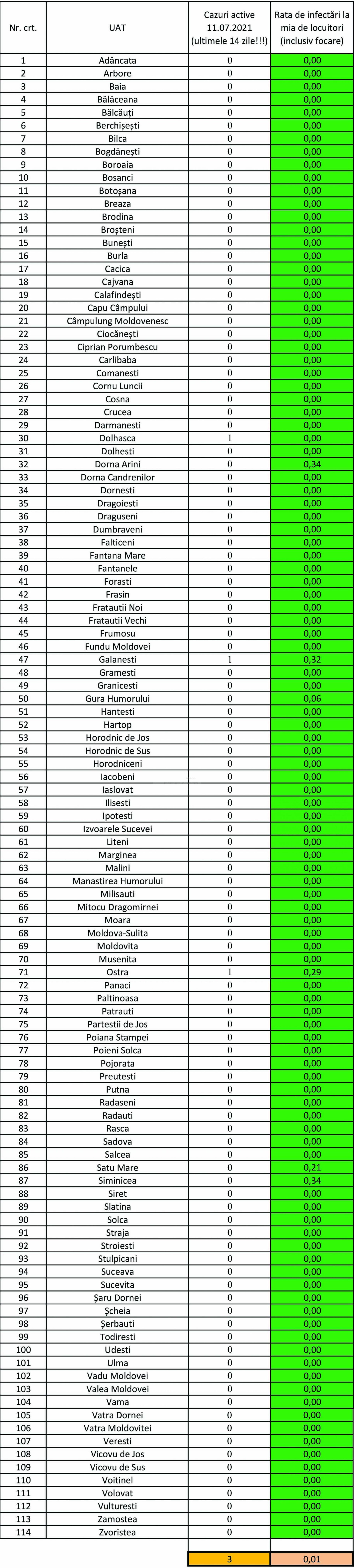 În același timp, Prefectura Suceava a informat că în județ doar trei localități mai au bolnavi de Covid, respectiv Dolhasca, Gălănești și Ostra. Potrivit distribuției cazurilor Covid-19 pe unități administrativ-teritoriale, din cele 114 localități, 111 nu au nici un caz de infecție Covid-19 în evoluție, iar 3 au câte un caz în evoluție. Acestea sunt singurele trei cazuri de infecție Covid-19 în evoluție la nivelul județului.