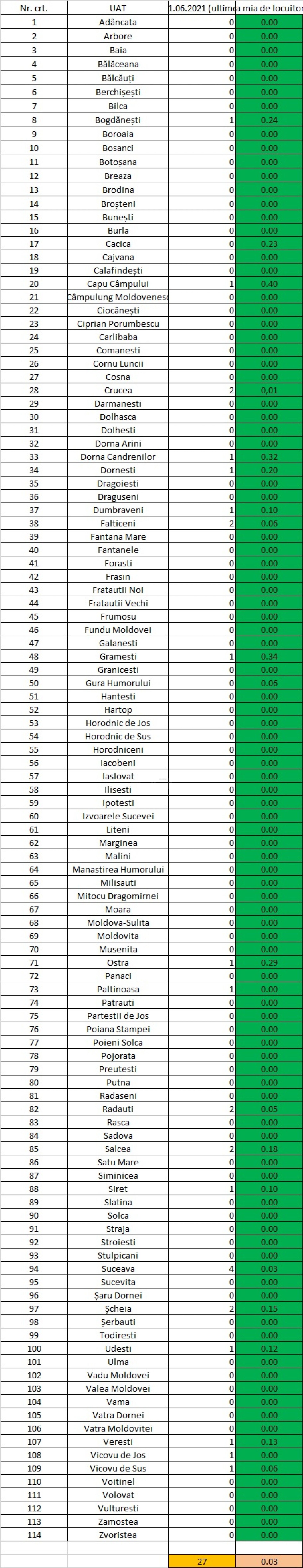 Județul Suceava mai avea, luni dimineață, doar 27 de cazuri de infecție Covid-19 active, care evoluează în 19 localități: câte un caz la Bogdănești, Capu Câmpului, Dorna Candrenilor, Dornești, Dumbrăveni, Grămești, Ostra, Păltinoasa, Siret, Udești, Verești, Vicovu de Jos și Vicovu de Sus; câte două cazuri în Crucea, Fălticeni, Rădăuți, Salcea și Șcheia și patru cazuri în municipiul Suceava. În municipiul Suceava incidența a scăzut la 0,03 la mie.