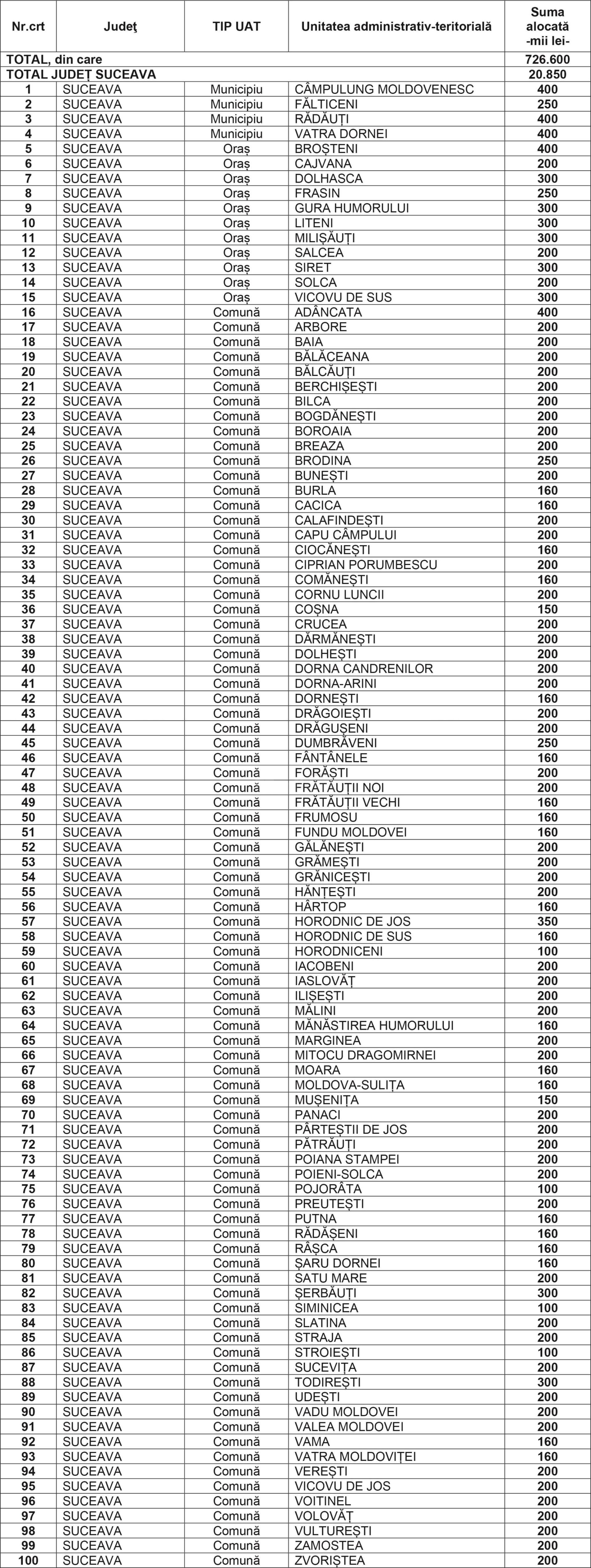 Din 114 unități administrativ teritoriale din județ, au fost alocate fonduri pentru 100. Sumele sunt cuprinse între 200 și 400 de mii de lei pentru municipii și orașe și între 100 și 400 de mii de lei la comune.