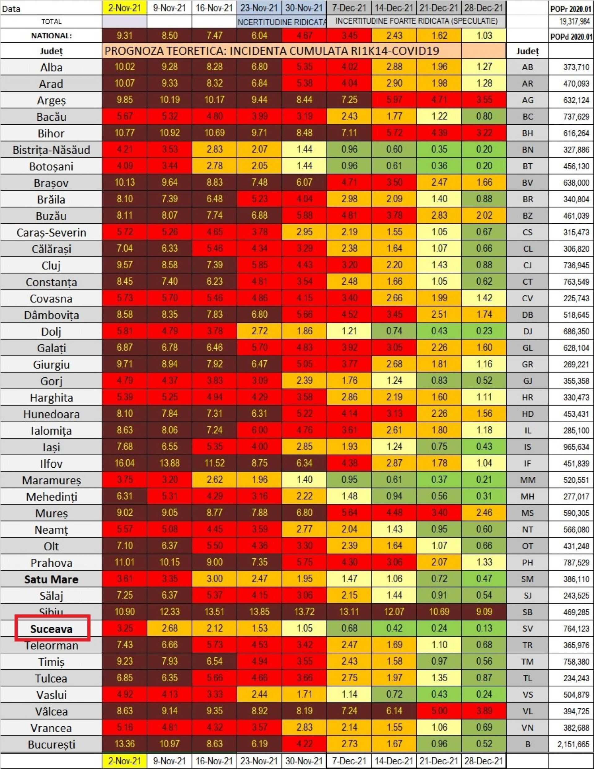 Cea mai scăzută incidență Covid din țară este în județul Suceava și se păstrează tendința de scădere. Joi, în județ incidența a fost de 3,33 la mie, cu 2.311 cazuri active. O prognoză teoretică publicată, miercuri, de medicul Octavian P. Jurma, din Timișoara, arată că dacă se menține actualul ritm al vaccinărilor și se respectă în continuare mijloacele de prevenție, de către majoritatea populației, județul Suceava va ieși din zona roșie a incidenței Covid în data de 9 noiembrie, iar până la sfârșitul acestei luni ar ajunge în jurul incidenței de 1 la mie, cu revenire în zona verde în prima săptămână din decembrie.