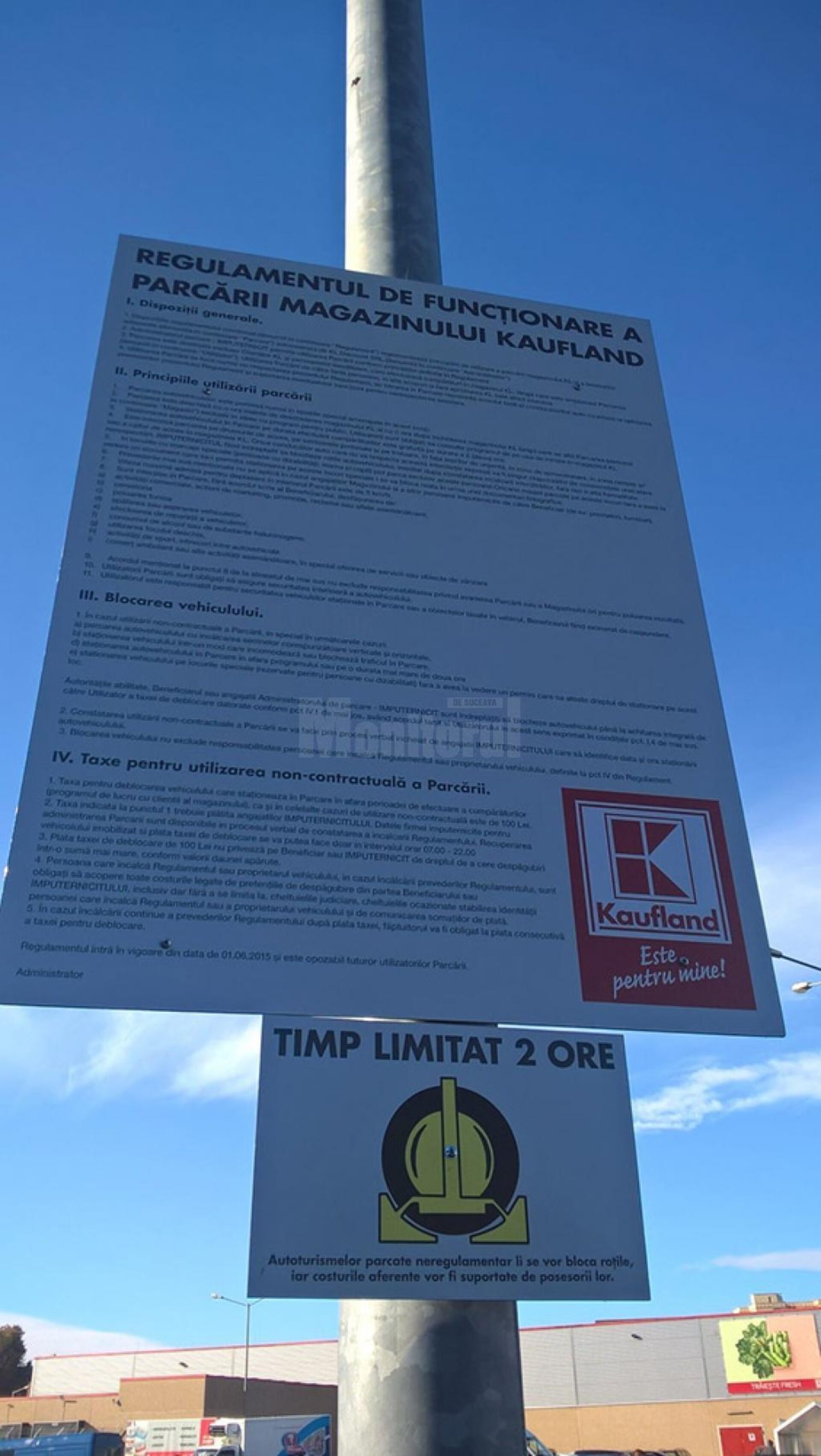 Conducerea magazinului Kaufland încearcă să impună un regulament de funcționare a parcării, cu un termen de staționare limitat la 2 ore. Pentru managerii magazinului problema ocupării locurilor de parcare de cei care nu sunt clienți este una veche, iar solicitările anterioare, transmise către Primăria municipiului Suceava, de montare a unor bariere pentru acces, nu au fost acceptate. Agenții de pază angajați de cei de la Kaufland stau în parcare și pun avertismente pe parbrizul autoturismelor care staționează mai mult de două ore. Mai mulți suceveni s-au arătat deranjați de faptul că agenții de pază practic îi pândesc atunci când coboară din mașini, iar dacă nu se îndreaptă spre intrarea în Kaufland, ci spre Piața Mică, de exemplu, sunt abordați agasant.