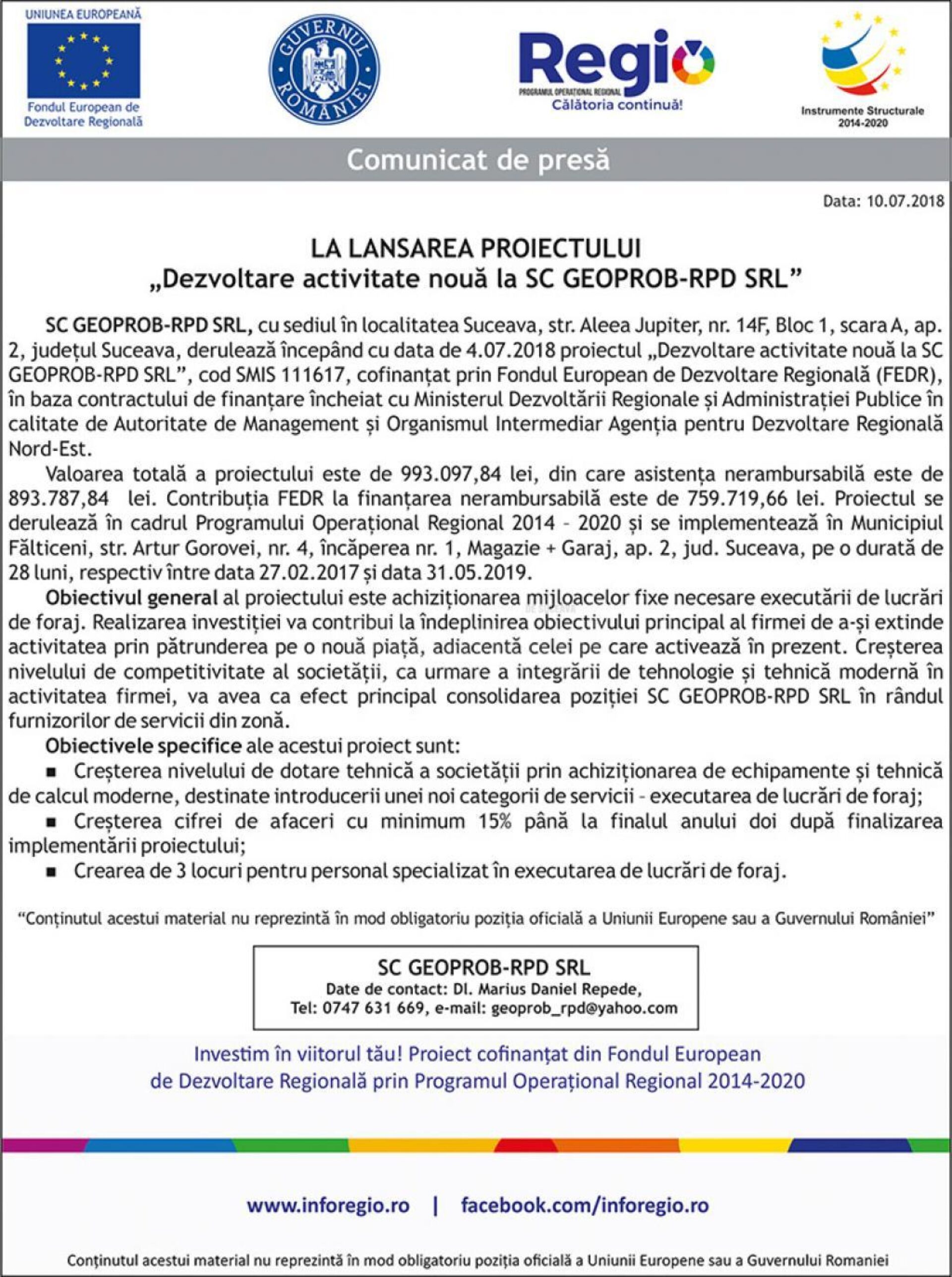 SC GEOPROB-RPD SRL, cu sediul în localitatea Suceava, str. Aleea Jupiter, nr. 14F, Bloc 1, scara A, ap. 2, județul Suceava, derulează începând cu data de 4.07.2018 proiectul „Dezvoltare activitate nouă la SC GEOPROB-RPD SRL”, cod SMIS 111617, cofinanțat prin Fondul European de Dezvoltare Regională (FEDR),în baza contractului de finanțare încheiat cu Ministerul Dezvoltării Regionale și Administrației Publice în calitate de Autoritate de Management și Organismul Intermediar Agenția pentru Dezvoltare Regională Nord-Est.