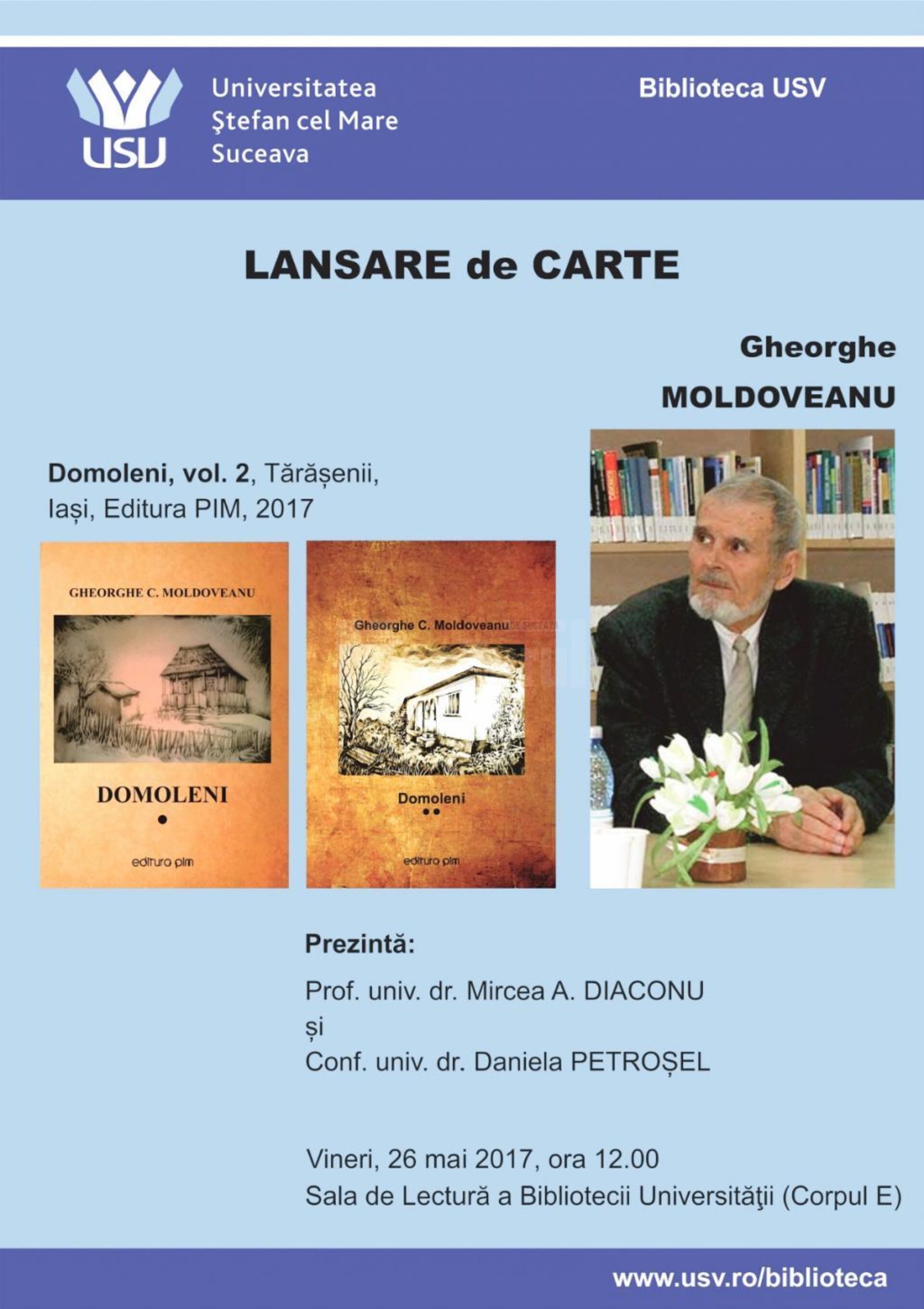 Vineri, 26 mai 2017, de la ora 12:00, în Sala de lectură (corpul E) a Bibliotecii Universității „Ștefan cel Mare” din Suceava, va avea loc lansarea cărții „Domoleni. Tărășenii”, semnată de universitarul sucevean Gheorghe C. Moldoveanu și publicat la Editura PIM, Iași, 2017. Volumul va fi prezentat de prof. univ. dr. Mircea A. Diaconu și conf. univ. dr. Daniela Petroșel. Prof. univ. dr. Gheorghe C. Moldoveanu, fost cadru didactic la Facultatea de Litere și Științe ale Comunicării, este autorul a numeroase studii, între care menționăm: „Istoria limbii române: Latina”, vol. 1, 2001; „Principii de scriere românească”, 2006; „Aron Pumnul – contribuții la dezvoltarea limbii și culturii românești din Bucovina”, 2007; „Din școală…”, 2011; „Dicționarul limbajului poetic al lui Octavian Goga”, 2013; „Izvorul Tămăduirii”, 2014; „Evoluția limbii române de la origini până în secolul al XV-lea”, 2015. De asemenea, a publicat multe articole de specialitate în revista Analele Universității „Ștefan cel Mare” din Suceava, Seria Filologie și în alte periodice științifice. Numele profesorului este legat și de organizarea edițiilor Colocviului Internațional de Științe ale Limbajului „Eugeniu Coșeriu” la Suceava, Cernăuți și Chișinău. Menționăm, de asemenea, că „Dicționarul limbajului poetic al lui Octavian Goga”, volum semnat de Gheorghe C. Moldoveanu, a primit Premiul Academiei Române în anul 2015.USV îi invită pe toți pasionații de lectură și dialog cultural la întâlnirea cu scriitorul și Profesorul Gheorghe C. Moldoveanu, dar și cu personajele volumului său Tărășenii din Domoleni.