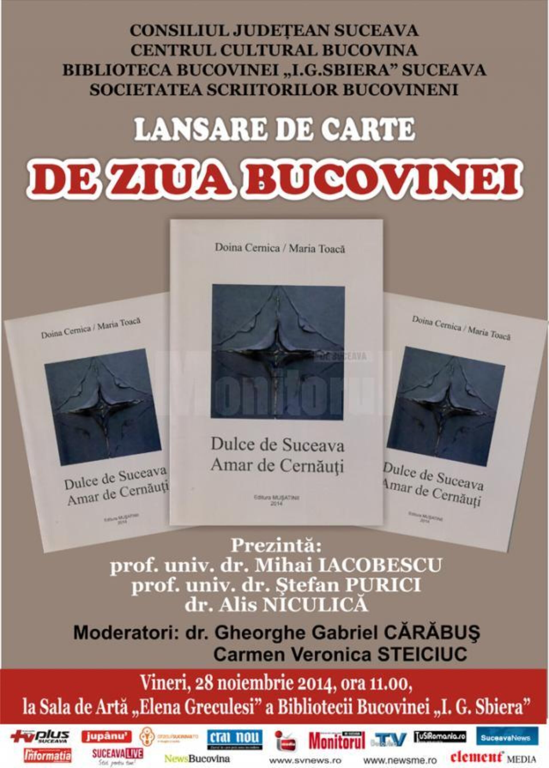 Consiliul Județean Suceava, Centrul Cultural Bucovina, Biblioteca Bucovinei „I.G. Sbiera” Suceava și Societatea Scriitorilor Bucovineni organizează vineri, 28 noiembrie, de Ziua Bucovinei, la ora 11.00, în Sala de Artă „Elena Greculesi” a bibliotecii publice sucevene, lansarea cărții „Dulce de Suceava – Amar de Cernăuți”, semnată de Doina Cernica și Maria Toacă. Prezintă: prof. univ. dr. Mihai Iacobescu, prof. univ. dr. Ștefan Purici și dr. Alis Niculică. Moderatori: dr. Gheorghe Gabriel Cărăbuș și Carmen Veronica Steiciuc.