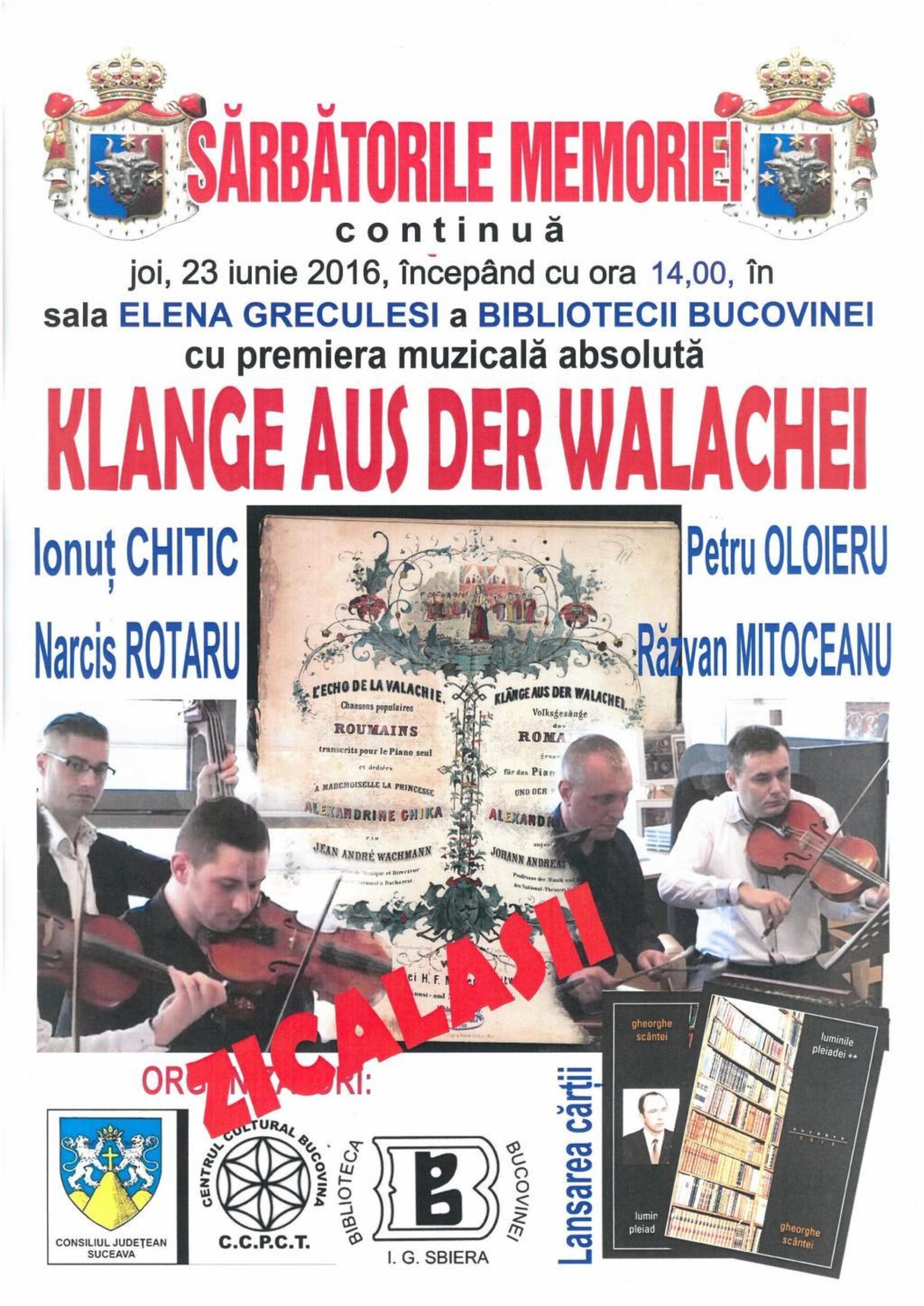 Manifestările cu genericul „Sărbătorile Memoriei” organizate de Consiliul Județean Suceava, Centrul Cultural Bucovina și Biblioteca Bucovinei „I.G. Sbiera” continuă joi, 23 iunie a.c., începând cu ora 14.00, în Sala de Artă „Elena Greculesi” a bibliotecii publice sucevene, cu lansarea celui de-al doilea volum cu titlul „Luminile pleiadei”, autor Gheorghe Scântei, și cu un nou concert al „Zicălașilor”, muzicienii Ionuț Chițac, Narcis Rotaru, Petru Oloieru și Răzvan Mitoceanu.