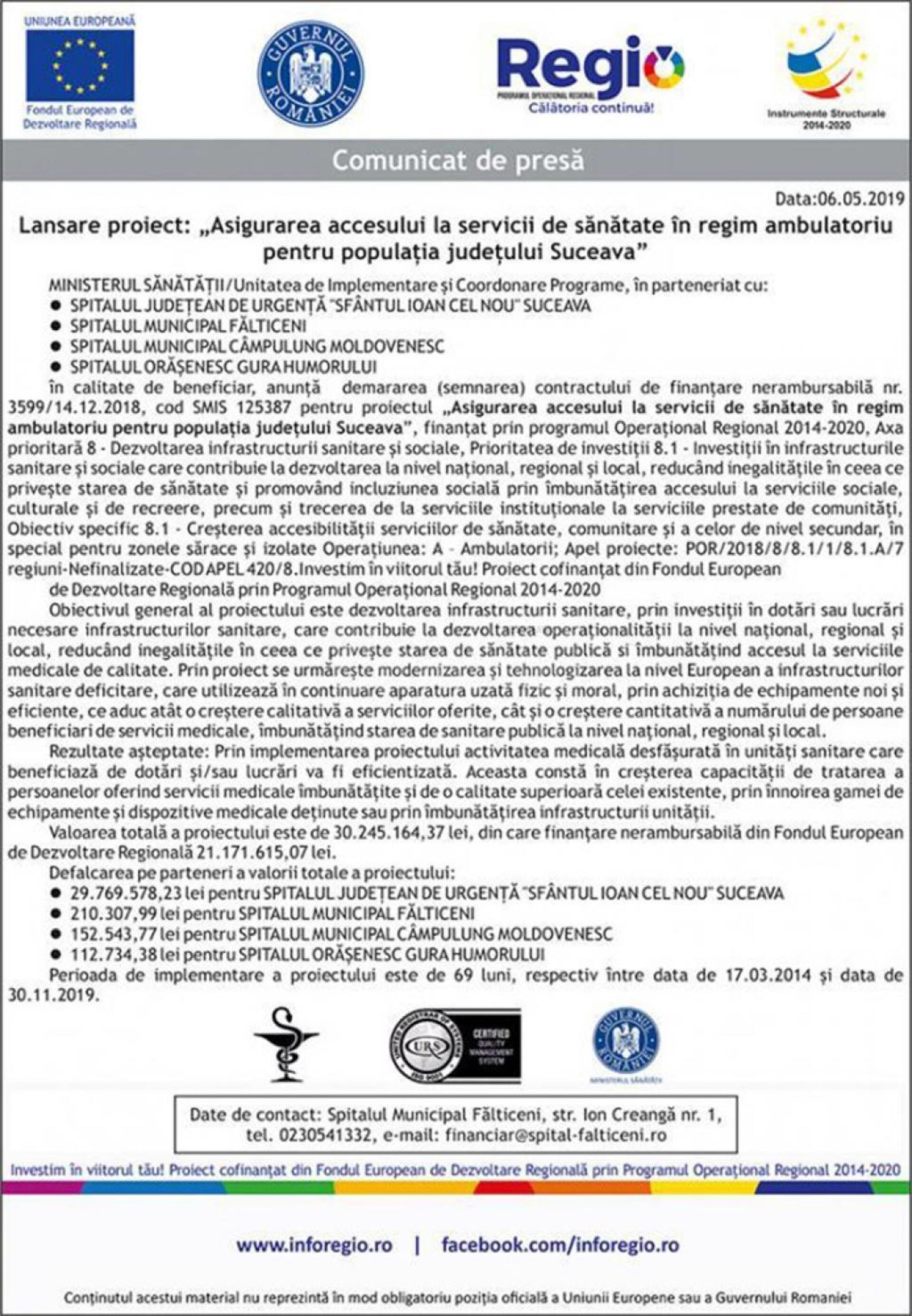 în calitate de beneficiar, anunță demararea (semnarea) contractului de finanțare nerambursabilă nr. 3599/14.12.2018, cod SMIS 125387 pentru proiectul „Asigurarea accesului la servicii de sănătate în regim ambulatoriu pentru populația județului Suceava”, finanțat prin programulOperațional Regional 2014-2020, Axa prioritară 8 – Dezvoltarea infrastructurii sanitare și sociale, Prioritatea de investiții 8.1 – Investiții în infrastructurile sanitare și sociale care contribuie la dezvoltarea la nivel național, regional și local, reducând inegalitățile în ceea ce privește starea de sănătate și promovând incluziunea socială prin îmbunătățirea accesului la serviciile sociale, culturale și de recreere, precum și trecerea de la serviciile instituționale la serviciile prestate de comunități, Obiectiv specific 8.1 – Creșterea accesibilității serviciilor de sănătate, comunitare și a celor de nivel secundar, în special pentru zonele sărace și izolate Operațiunea: A – Ambulatorii; Apel proiecte: POR/2018/8/8.1/1/8.1.A/7 regiuni-Nefinalizate-COD APEL 420/8.
