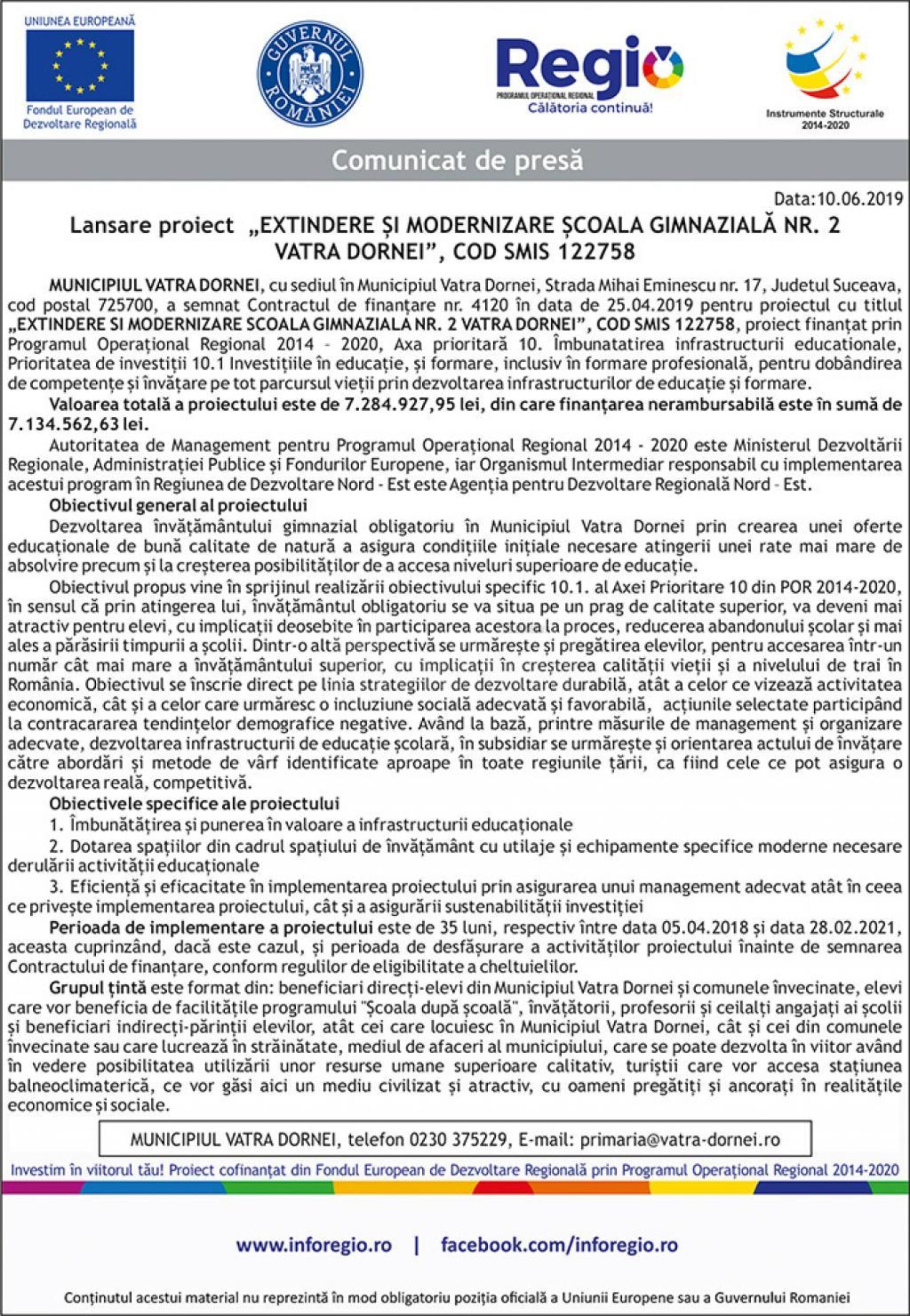 MUNICIPIUL VATRA DORNEI, cu sediul în Municipiul Vatra Dornei, Strada Mihai Eminescu nr. 17, Judetul Suceava, cod postal 725700, a semnat Contractul de finanțare nr. 4120 în data de 25.04.2019 pentru proiectul cu titlul „EXTINDERE SI MODERNIZARE SCOALA GIMNAZIALA NR. 2 VATRA DORNEI”, COD SMIS 122758, proiect finanțat prin Programul Operațional Regional 2014 – 2020, Axa prioritară 10. Îmbunatatirea infrastructurii educationale, Prioritatea de investiții 10.1 Investițiile în educație, și formare, inclusiv în formare profesională, pentru dobândirea de competențe și învățare pe tot parcursul vieții prin dezvoltarea infrastructurilor de educație și formare.