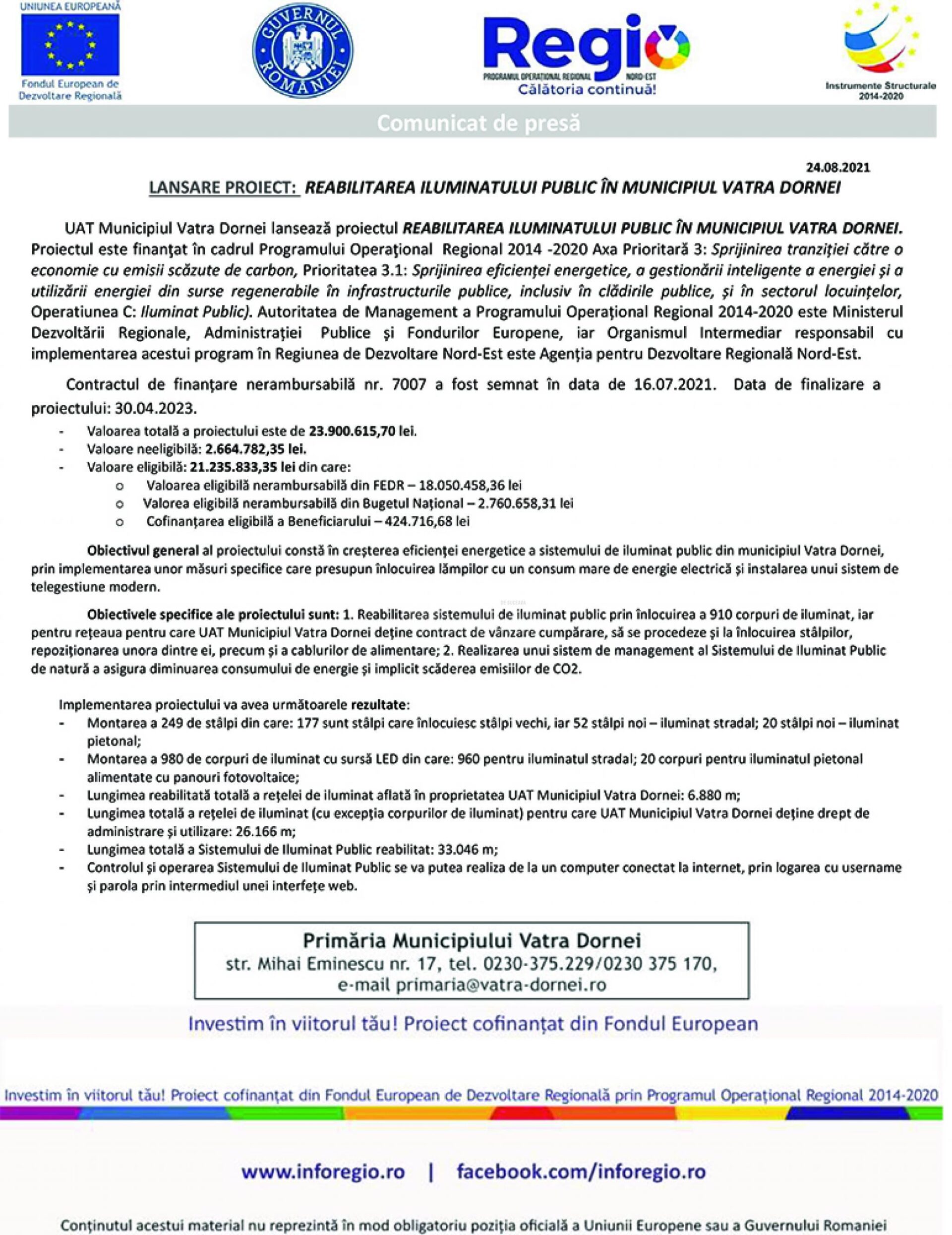 UAT Municipiul Vatra Dornei lansează proiectul REABILITAREA SISTEMULUI DE ILUMINAT PUBLIC ÎN MUNICIPIUL VATRA DORNEI. Proiectul este finanțat în cadrul Programului Operațional Regional 2014 -2020 Axa Prioritară 3:Sprijinirea tranziției către o economie cu emisii scăzute de carbon, Prioritatea 3.1:Sprijinirea eficienței energetice, a gestionării inteligente a energiei și a utilizării energiei din surse regenerabile în infrastructurile publice, inclusiv în clădirile publice, și în sectorul locuințelor, Operatiunea C:Iluminat Public).AutoritateadeManagementaProgramuluiOperaționalRegional2014-2020esteMinisterulDezvoltăriiRegionale,AdministrațieiPubliceșiFondurilorEuropene,iarOrganismulIntermediarresponsabilcuimplementareaacestuiprogramînRegiuneadeDezvoltareNord-Est esteAgenția pentruDezvoltareRegională Nord-Est.