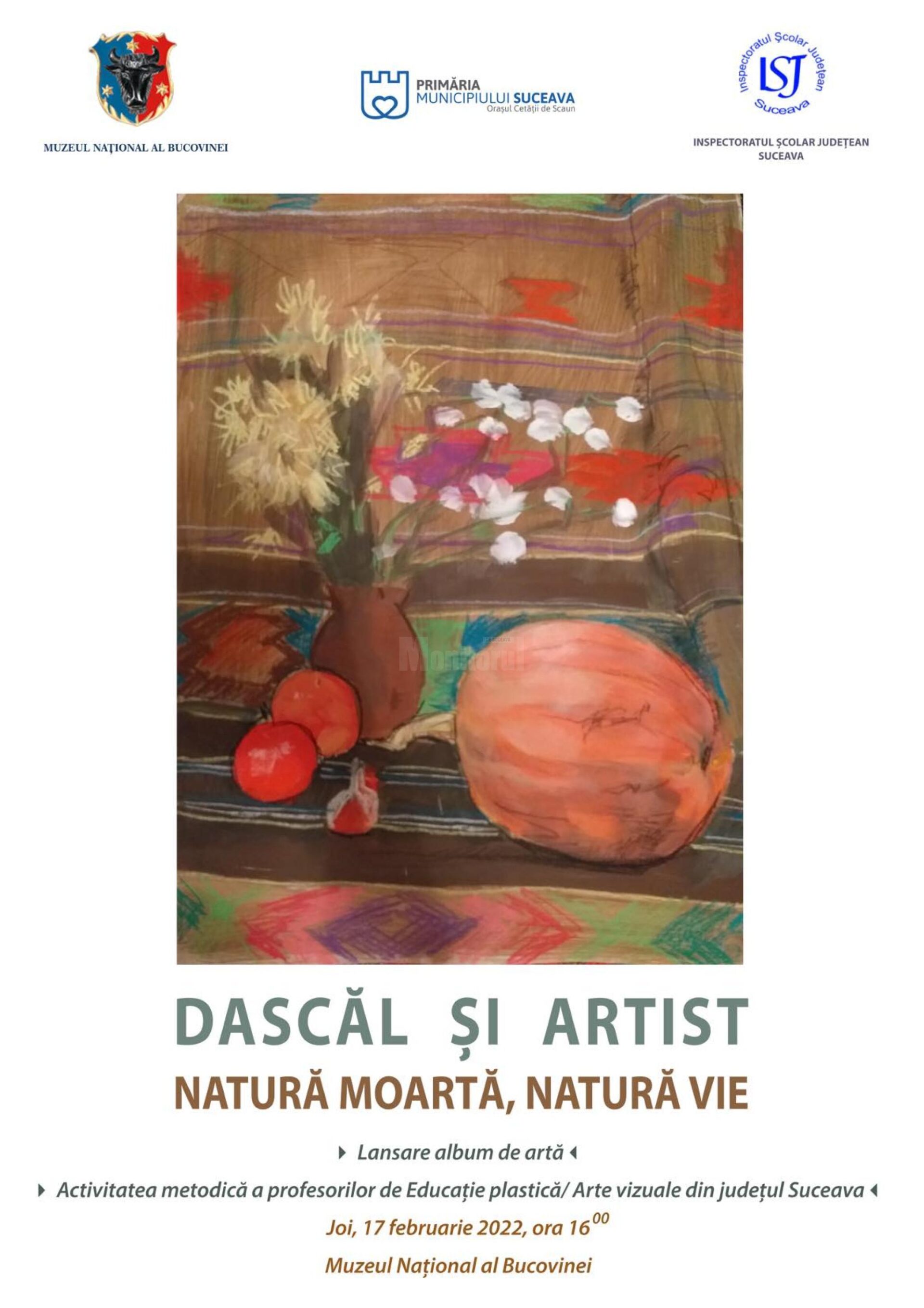 La Muzeul Național al Bucovinei va avea loc joi, 17 februarie 2022, la ora 16:00, lansarea albumului de artă „Dascăl și Artist. Natură moartă, natură vie”. Gruparea „Dascăl și artist” implementează proiecte în domeniul artelor vizuale, muzicii, dar și proiecte educaționale destinate tuturor categoriilor de vârstă.