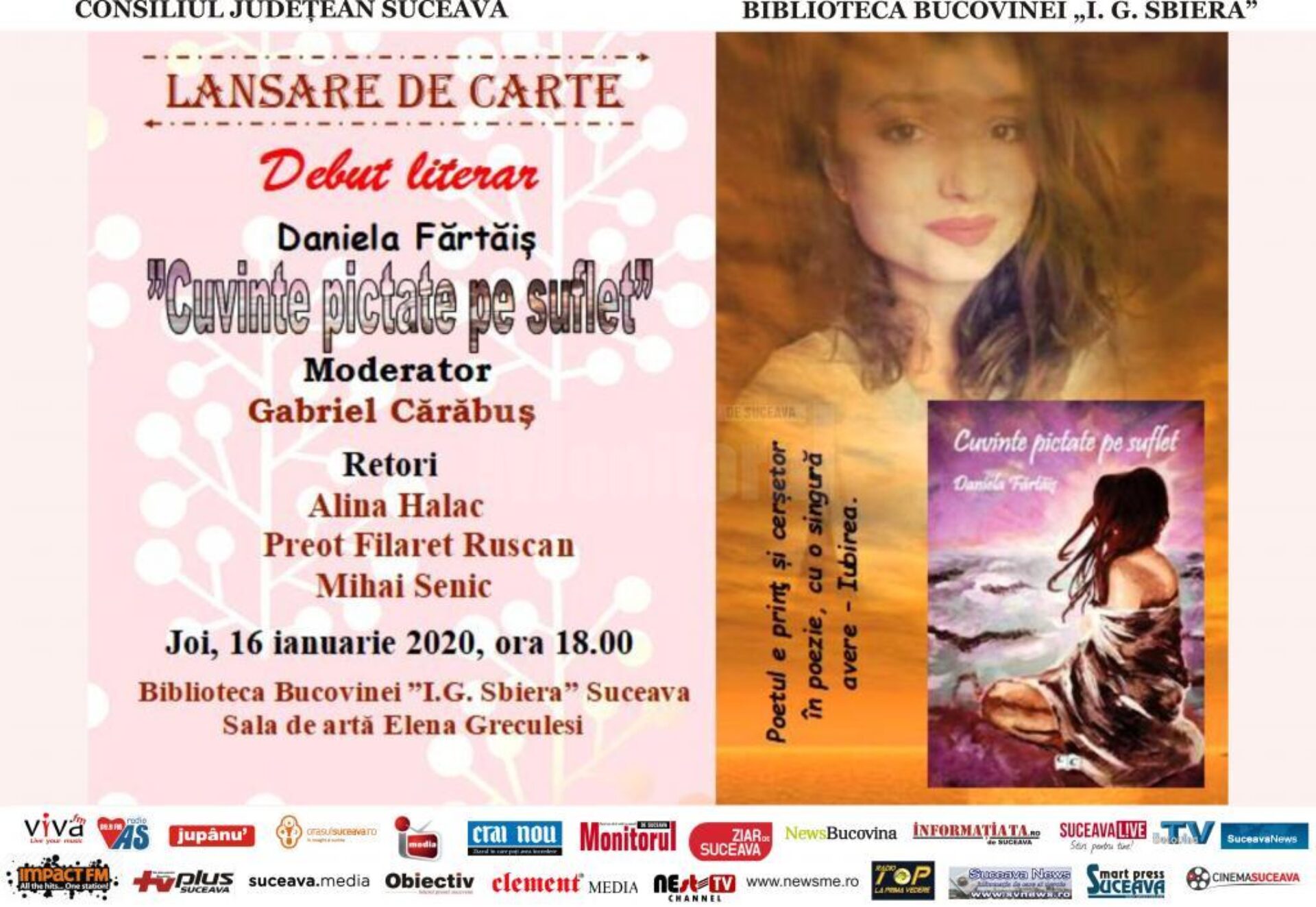 La Biblioteca Bucovinei „I.G.Sbiera” va avea loc joi, 16 ianuarie, de la ora 18,00, lansarea cărții „Cuvinte pictate pe suflet”, a Danielei Fărtăiș. Retori: Alina Halac, preot Filaret Ruscan, Mihai Senic.