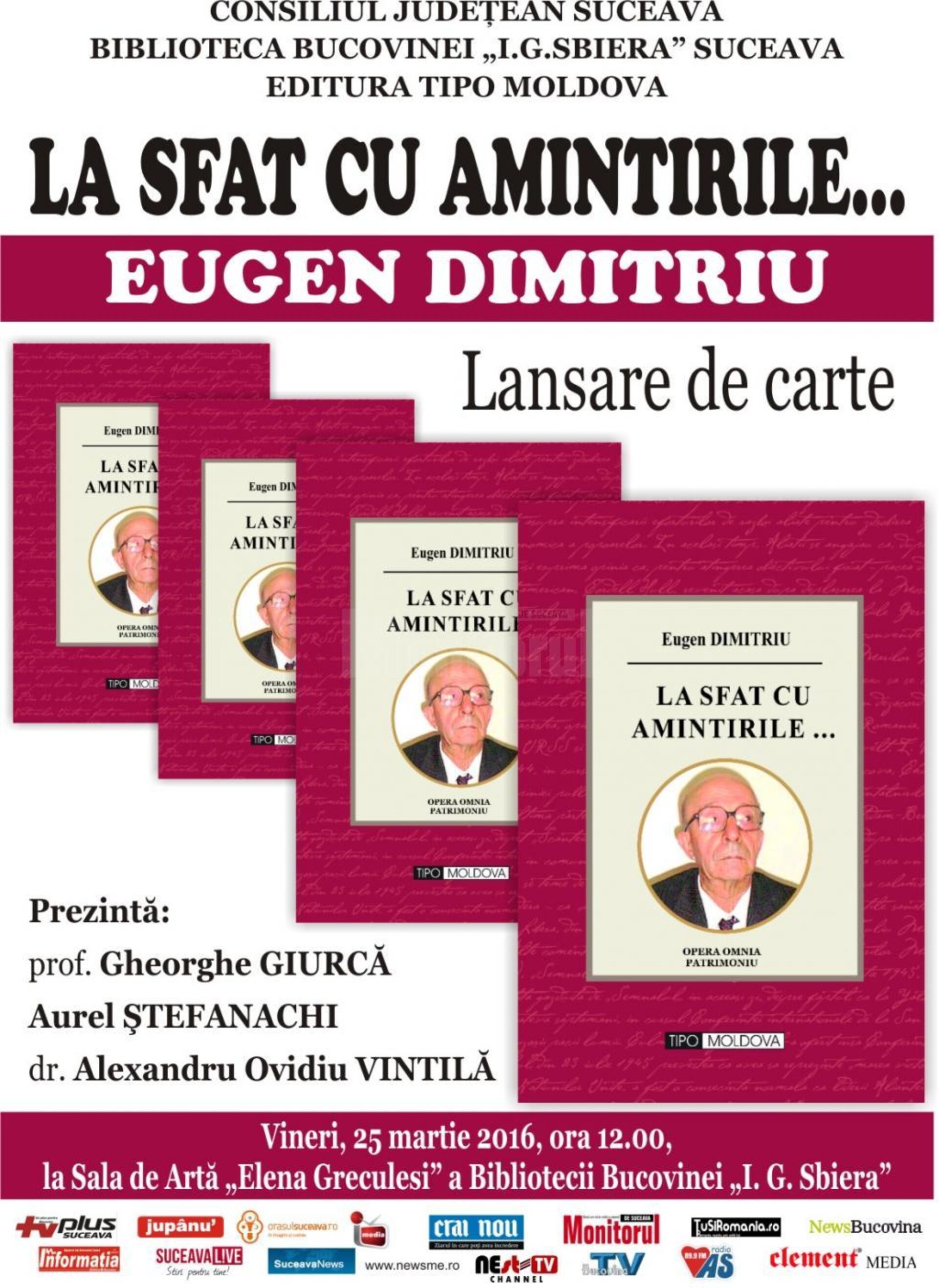 Consiliul Județean Suceava, Biblioteca Bucovinei „I.G. Sbiera” și Editura Tipo Moldova Iași organizează vineri, 25 martie a.c., la ora 12.00, în Sala de Artă „Elena Greculesi” a bibliotecii publice sucevene, lansarea volumului „La sfat cu amintirile…”, care poartă semnătura scriitorului nonagenar Eugen Dimitriu. Prezintă: prof. Gheorghe Giurcă, Aurel Ștefanachi, dr. Alexandru Ovidiu Vintilă.