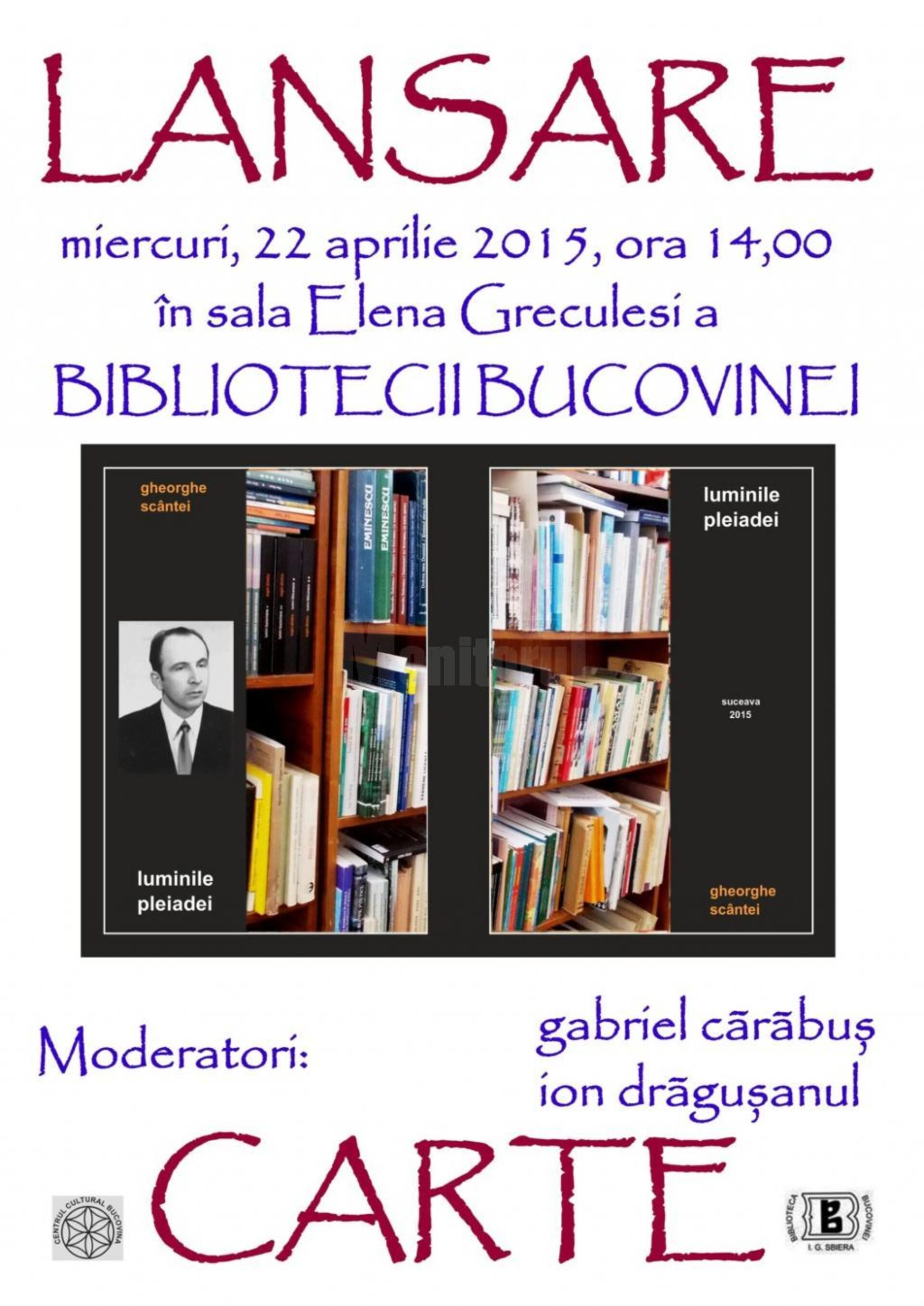 În Sala de Artă „Elena Greculesi” a Bibliotecii Bucovinei „I.G. Sbiera” din municipiul Suceava va avea loc miercuri, 22 aprilie a.c, la ora 14.00, lansarea cărții „Luminile pleiadei”, de Gheorghe Scântei.Cartea, editată de Centrul Cultural Bucovina, „tezaurizează înțelepciune”, așa cum spune scriitorul Ion Drăgușanul.Moderatorii evenimentului sunt Gheorghe Gabriel Cărăbuș, directorul bibliotecii publice sucevene, și scriitorul Ion Drăgușanul.
