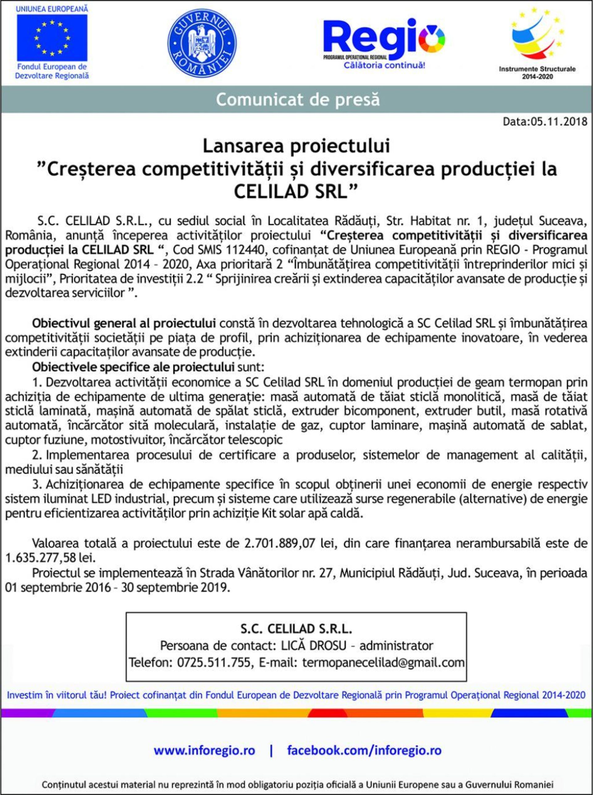 S.C. CELILAD S.R.L., cu sediul social în Localitatea Rădăuți, Str. Habitat nr. 1, județul Suceava, România, anunță începerea activităților proiectului “Creșterea competitivității și diversificarea producției la CELILAD SRL “, Cod SMIS 112440, cofinanțat de Uniunea Europeană prin REGIO – Programul Operațional Regional 2014 – 2020, Axa prioritară 2 “Îmbunătățirea competitivității întreprinderilor mici și mijlocii”, Prioritatea de investiții 2.2 “Sprijinirea creării și extinderea capacităților avansate de producție și dezvoltarea serviciilor ”.