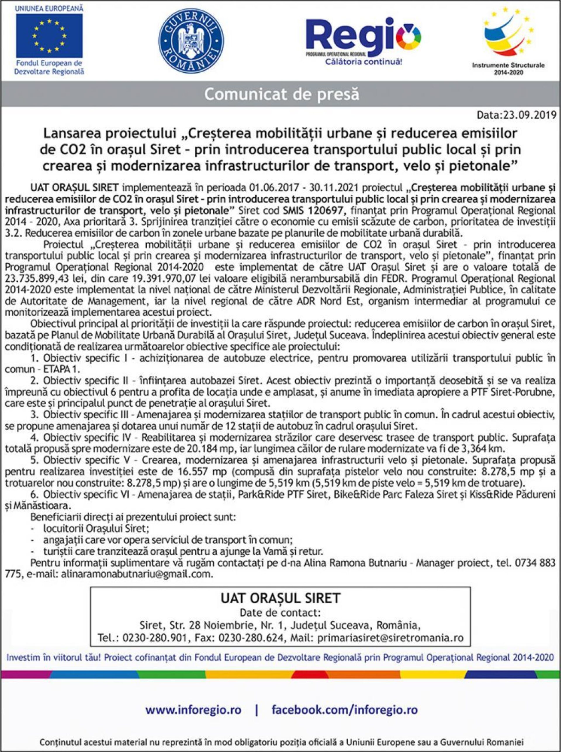 Proiectul „Creșterea mobilității urbane și reducerea emisiilor de CO2 în orașul Siret – prin introducerea transportului public local și prin crearea și modernizarea infrastructurilor de transport, velo și pietonale”, finanțat prin Programul Operațional Regional 2014-2020 este implementat de către UAT Orașul Siret și are o valoare totală de 23.735.899,43 lei, din care 19.391.970,07 lei valoare eligibilă nerambursabilă din FEDR. Programul Operațional Regional 2014-2020 este implementat la nivel național de către Ministerul Dezvoltării Regionale, Administrației Publice, în calitate de Autoritate de Management, iar la nivel regional de către ADR Nord Est, organism intermediar al programului ce monitorizează implementarea acestui proiect.