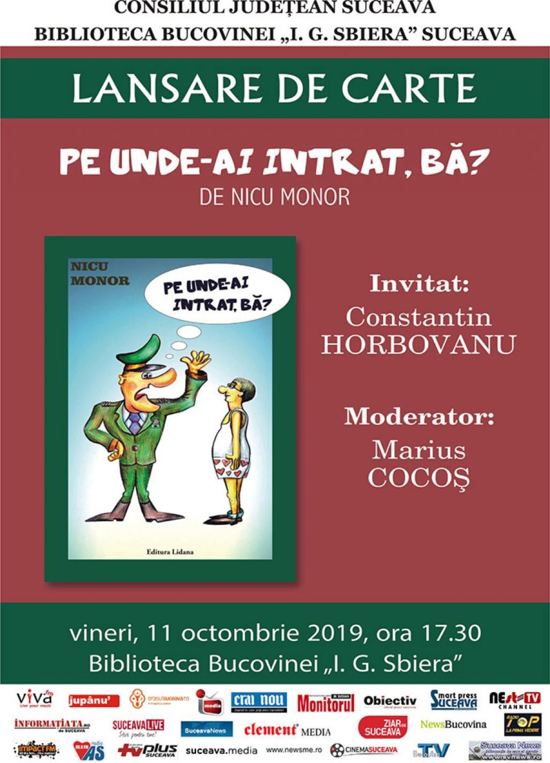 Consiliul Județean Suceava și Biblioteca Bucovinei „I.G. Sbiera” Suceava organizează vineri, 11 octombrie, de la ora 17:30, la Biblioteca Bucovinei, lansarea de carte „Pe unde-ai intrat, bă” de Nicu Monor. Invitat: Constantin Horbovanu. Moderator: Marius Cocoș.