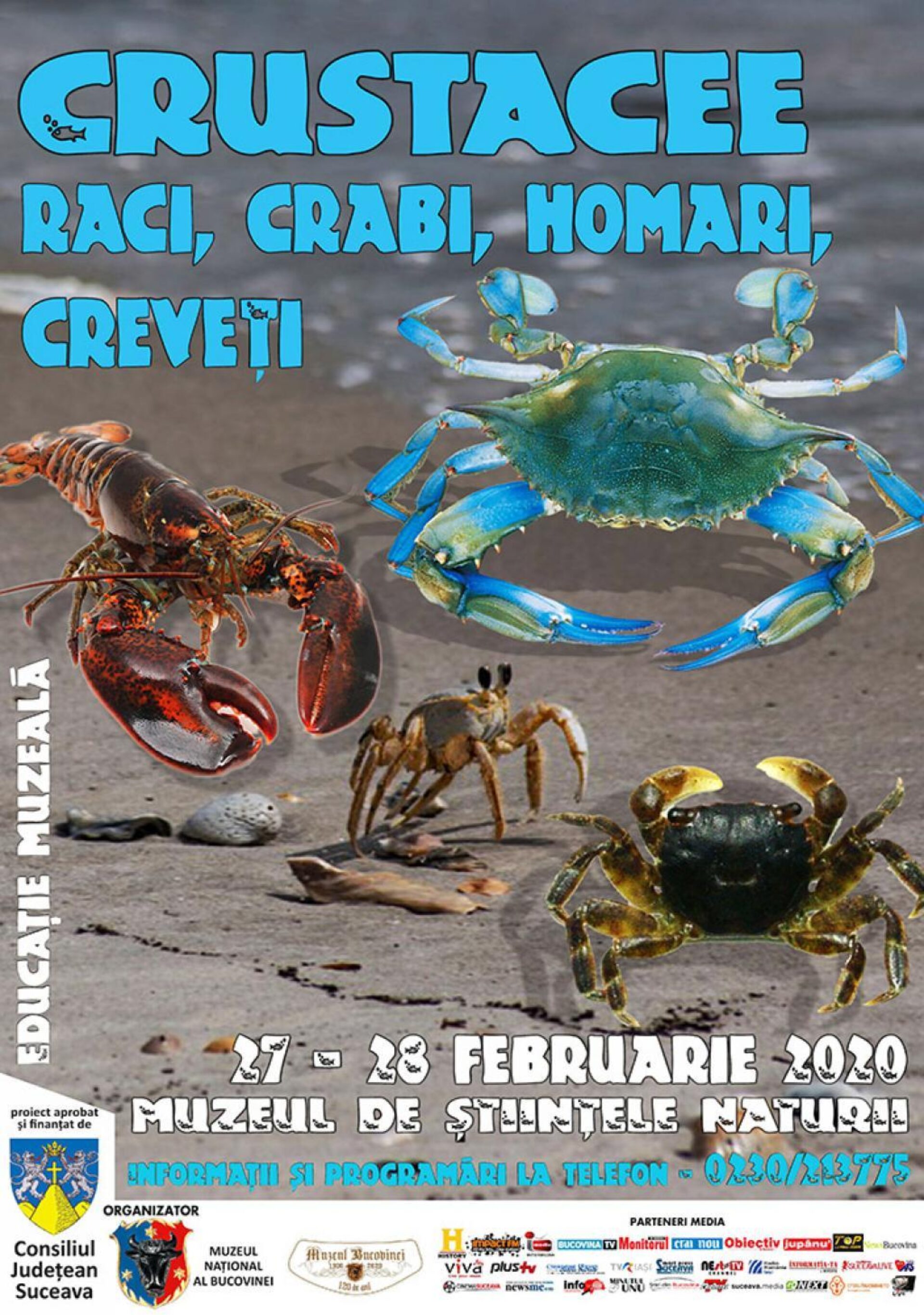 Muzeul de Științele Naturii îi invită pe elevi, studenți să participe la lecția de muzeu intitulată „Crustacee – raci, crabi, homari, creveți”, care se va desfășura, în zilele de 27 și 28 februarie 2020, începând cu ora 10:00, în Sala de Conferințe a Muzeului de Istorie din Suceava. Ora de muzeu este organizată cu prilejul sărbătoririi, pe 3 martie, a Zilei Mondiale a Faunei Sălbatice. Această lecție de muzeu se adresează preșcolarilor, elevilor din școlile primare, gimnaziale, liceale și studenților din municipiul și de pe teritoriul județului Suceava. „În cadrul acestei lecții muzeale vor fi prezentate materiale biologice vii și curiozități despre modul de hrănire, mediul de viață și comportamentul crustaceelor dispărute, fosile vii și actuale”, anunță organizatorii.