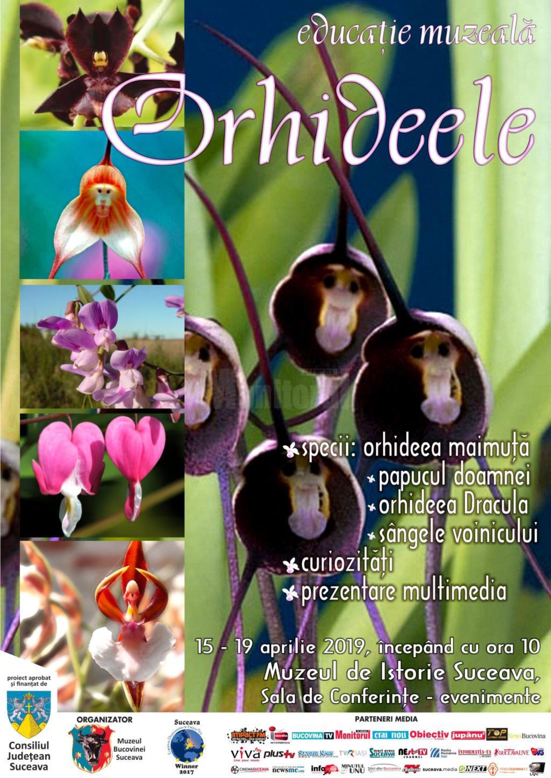 Muzeul Bucovinei, prin specialiștii de la Muzeul de Științe ale Naturii din Suceava, continuă seria proiectelor de educație muzeală, în perioada 15-19 aprilie 2019, în preajma Zilei internaționale a Pământului, sărbătorită pe 22 aprilie, cu lecția de muzeu intitulată „Orhideele”. Ora de muzeu va fi susținută cu începere de la ora 10, în Sala de Conferințe de la Muzeul de Istorie din Suceava. Vor fi prezentate date generale despre modul de hrănire, răspândirea geografică și importanța acestor plante în viața cotidiană umană. Lecția de muzeu va aduce informații prețioase cu privire la speciile de orhideele spontane protejate (papucul-doamnei, sângele voinicului, poroinic, untul–vacii) care se găsesc pe teritoriul României. Din zonele tropicale vor fi prezentate informații despre orhideea păianjen, orhideea maimuță, orhideea Dracula și alte specii.