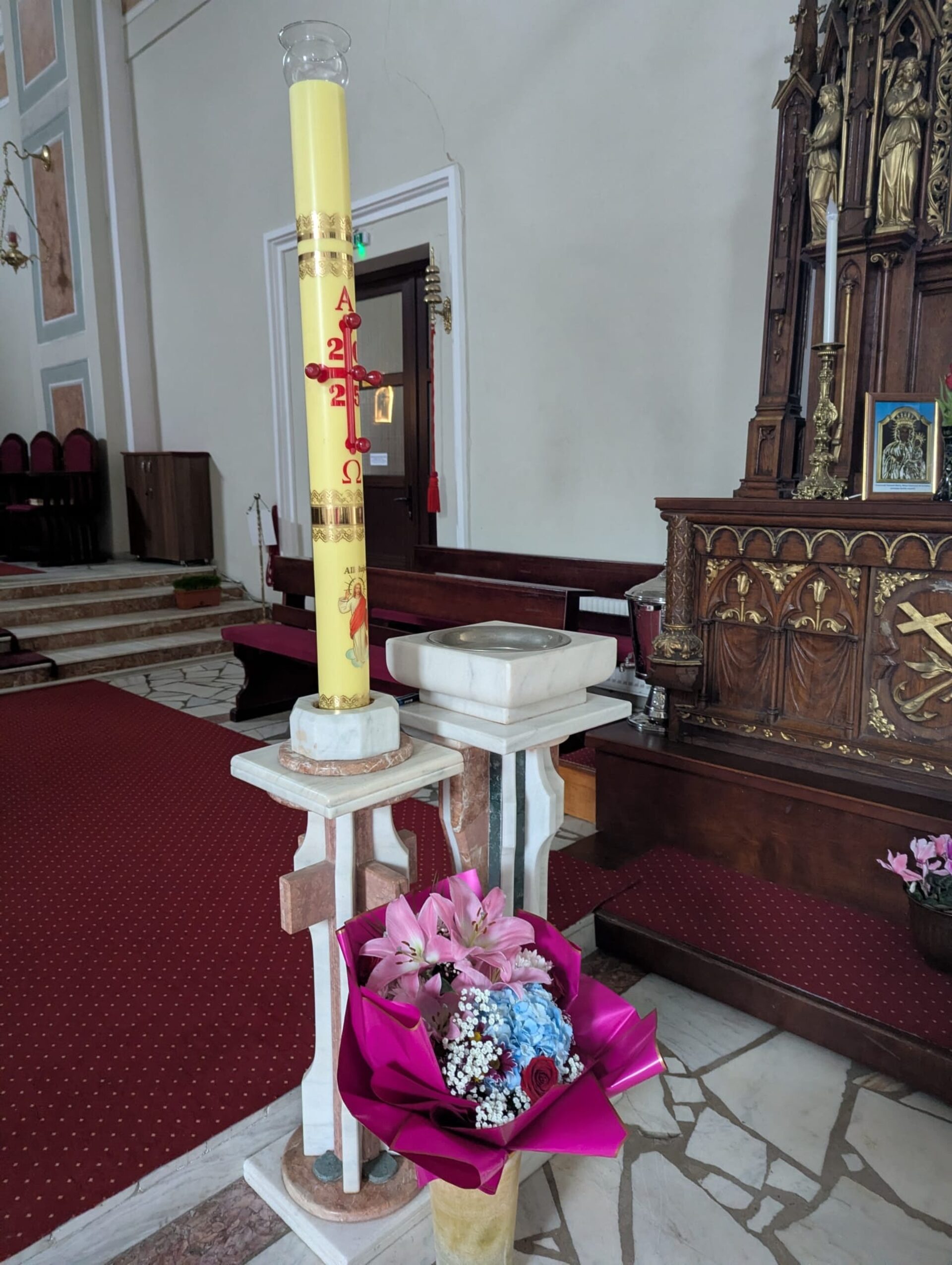 Lumina lui Cristos este simbolizată, conform tradiţiei, prin Lumânarea Pascală sau lumânarea de Paşti, confecţionată special, în fiecare an, având inscripţionată imaginea Învierii, semnele greceşti Alfa şi Omega, „Eu sunt Alfa şi Omega”, adică începutul şi sfârşitul, şi anul în curs, 2026. Lumânarea Pascală va sta în biserică tot timpul anului.