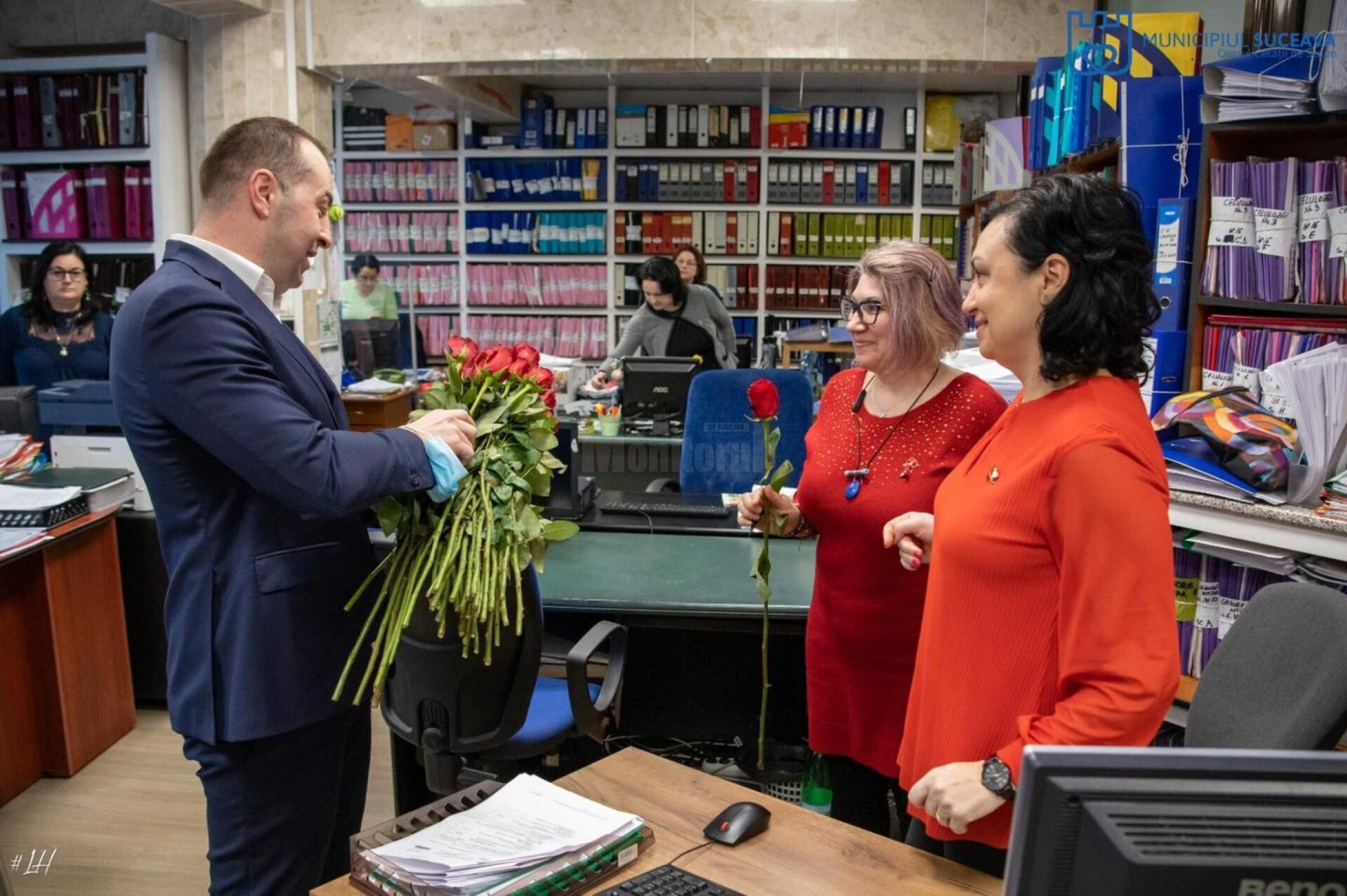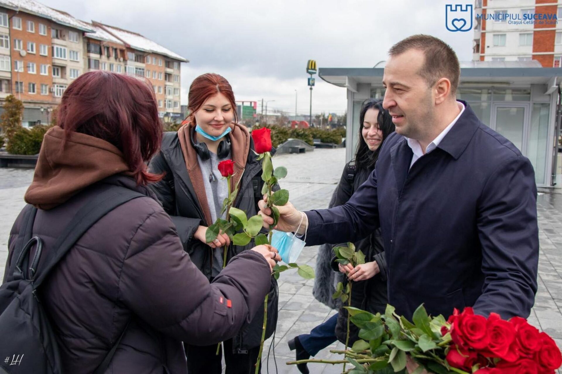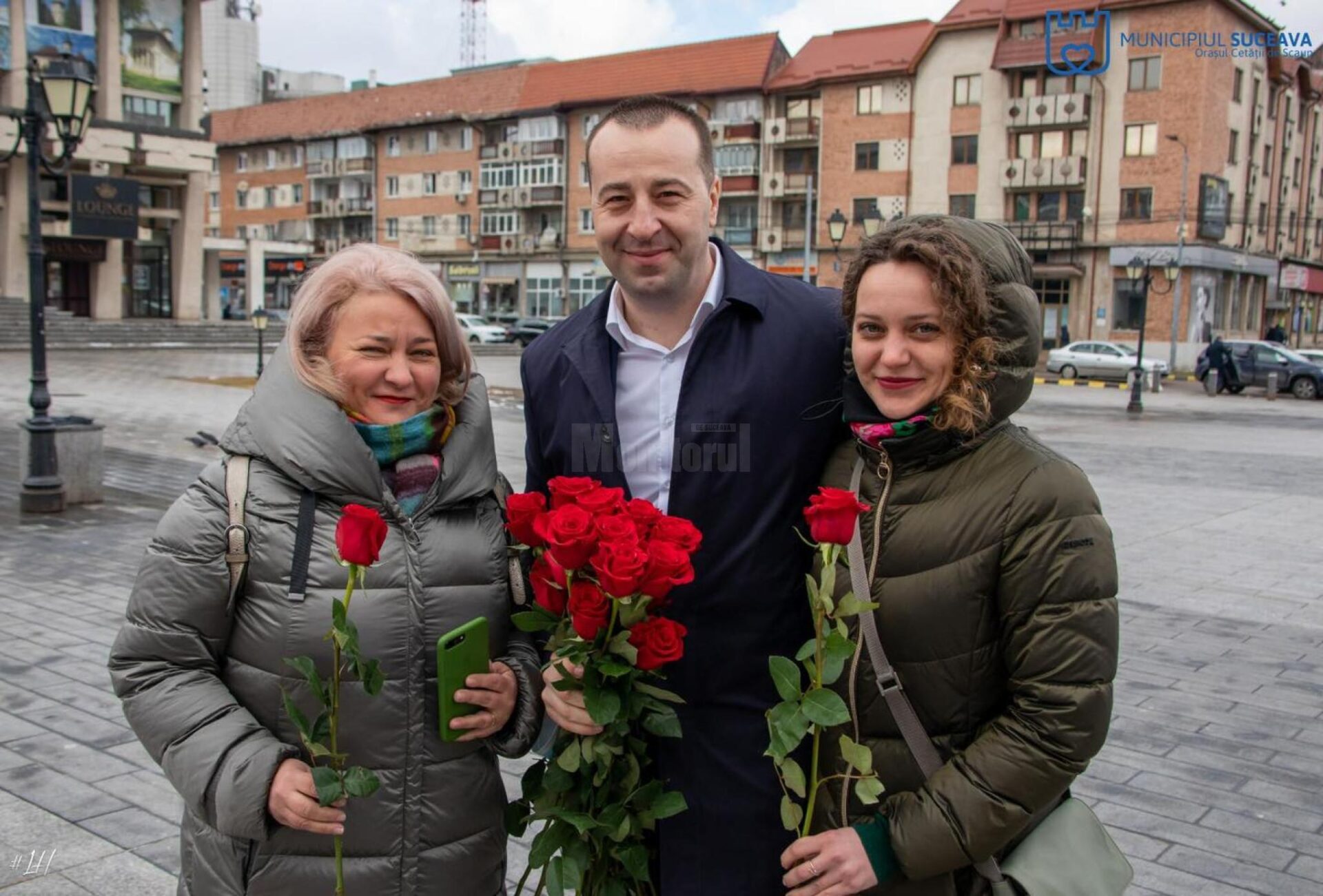 Viceprimarul municipiului Suceava, Lucian Harșovschi, a oferit mii de trandafiri de toate culorile, atât colegelor din primărie, femeilor celor pe care le-a întâlnit pe străzile orașului, fără a uita nici de refugiatele cazate în sala de sport a Școlii nr. 11 Miron Costin.