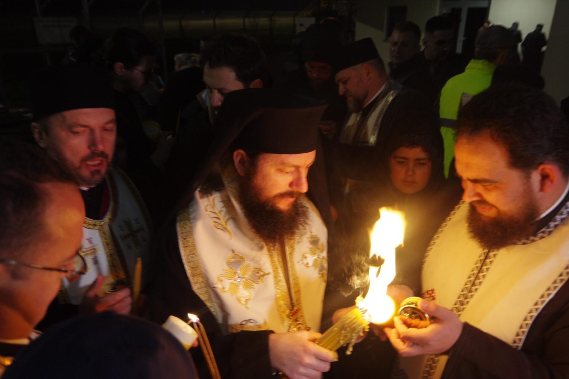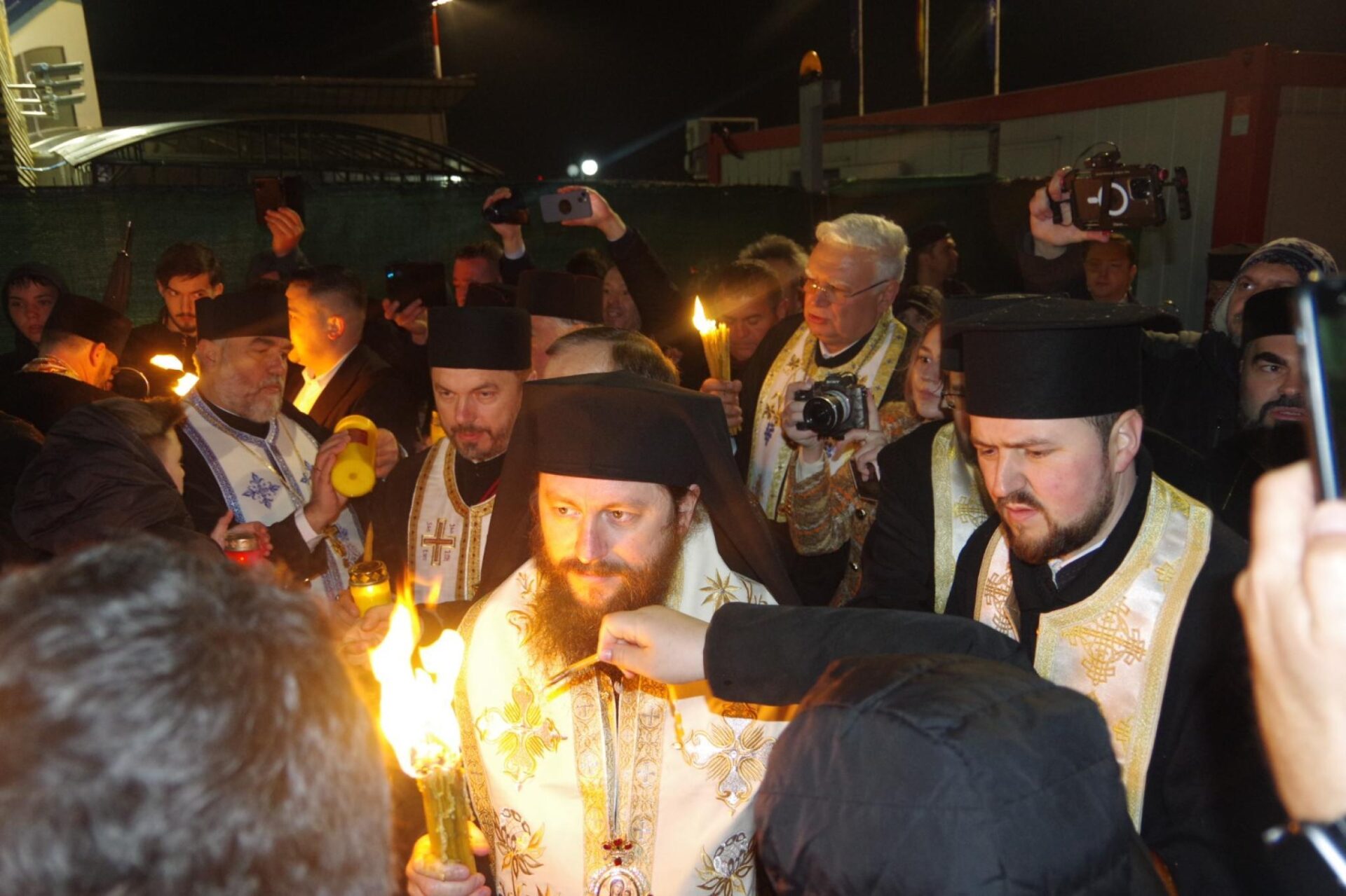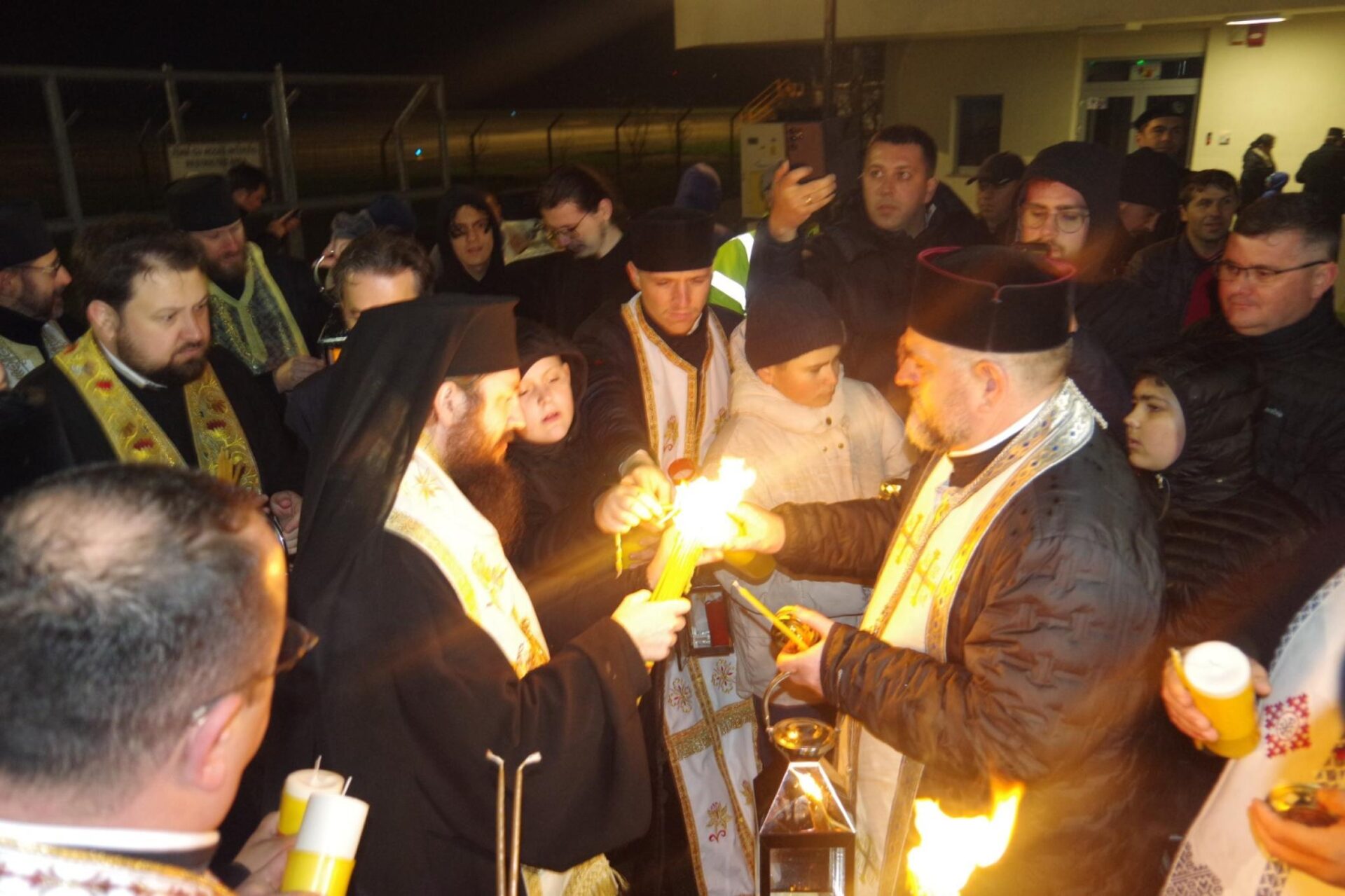 După ce a aprins lumânările cu Lumina Sfântă, PS Damaschin Dorneanul a fost întâmpinat cu cântece bisericești de toți preoții prezenți la aeroport. Aceștia și-au aprins candelele sau lumânările și au plecat spre parohiile în care slujesc.