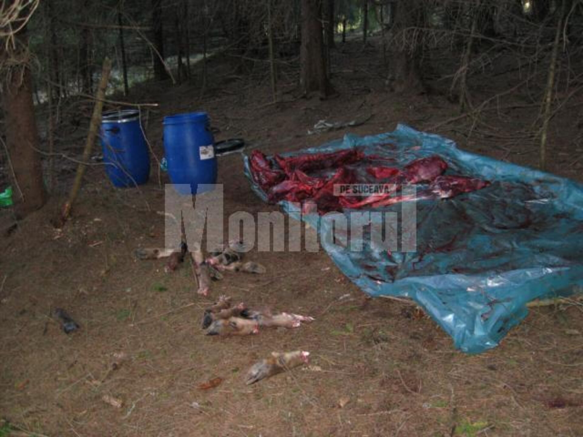 Căprioare jupuite, butoaie din plastic umplute cu bucăți de carne, intestine și puii femelelor, scoși în grabă și aruncați printre celelalte resturi.