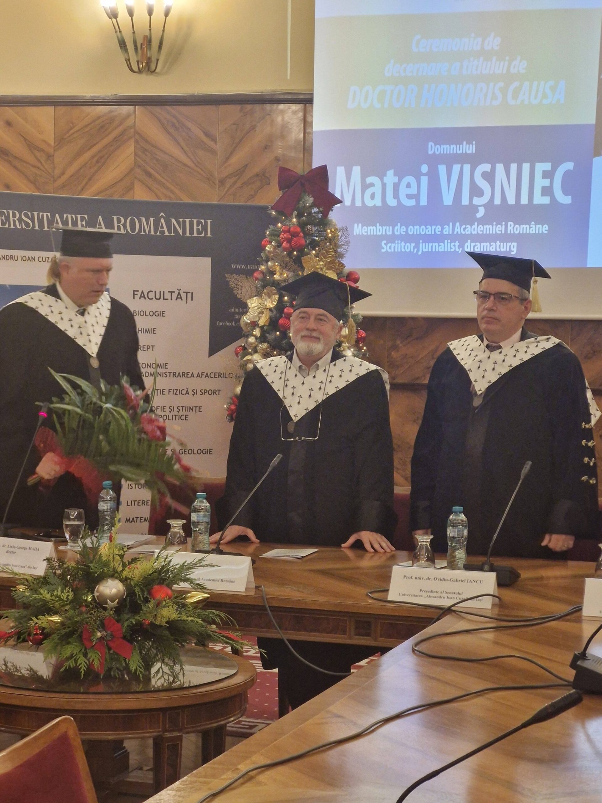 ”La propunerea Facultății de Litere, avem privilegiul și onoarea de a acorda titlul de doctor al Universității <Alexandru Ion Cuza>, din Iași, unuia dintre cei mai importanți dramaturgi, poeți și scriitori ai literaturii române – Matei Vișniec, membru de onoare al Academiei Române. Este un moment deosebit, în care celebrăm nu numai opera literară remarcabilă a domnului Matei Vișniec, ci și un creator de punți culturale, un spirit lucid și generos, un ambasador al culturii române în lume. De zeci de ani, domnul Matei Vișniec reușește să transforme cuvintele în spații de dialog, să deschidă, prin teatru și literatură, ferestre spre sensibilitățile și frământările umane, să aducă publicului o artă a interogării și a libertății. Distinsul nostru laureat este, fără îndoială, o personalitate care se impune prin creativitate, curaj intelectual și consecvența cu care a cultivat valori pentru lumea noastră”, a spus Liviu-George Maha, rectorul Universității ”Alexandru Ioan Cuza” Iași.