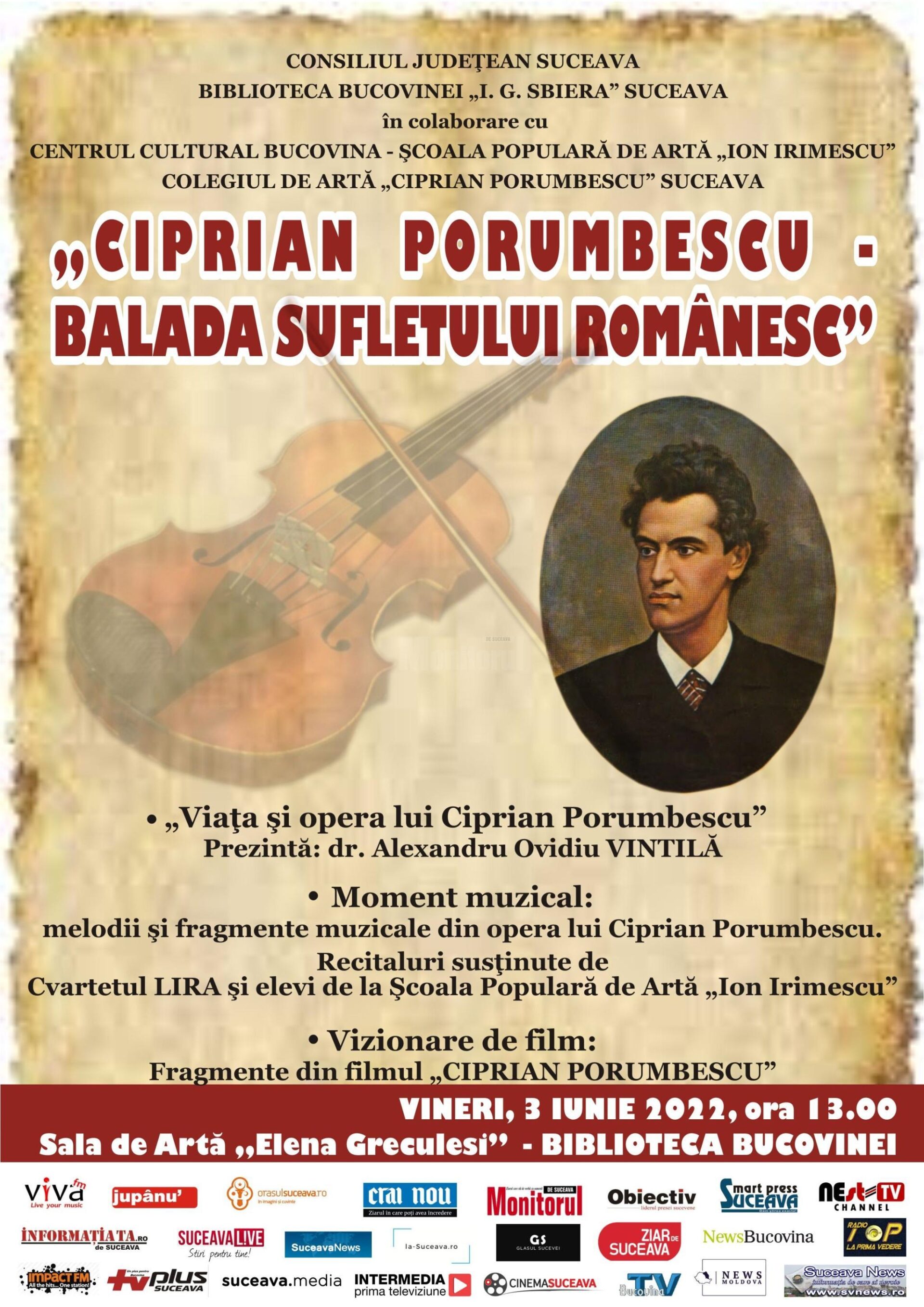 Biblioteca Bucovinei „I. G. Sbiera”, sub egida Consiliului Județean Suceava, în colaborare cu Colegiul de Artă „Ciprian Porumbescu” Suceava și Centrul Cultural Bucovina – Școala Populară de Artă „Ion Irimescu”, organizează vineri, 3 iunie, începând cu ora 13.00, manifestarea omagială „Ciprian Porumbescu – Balada Sufletului Românesc”.
