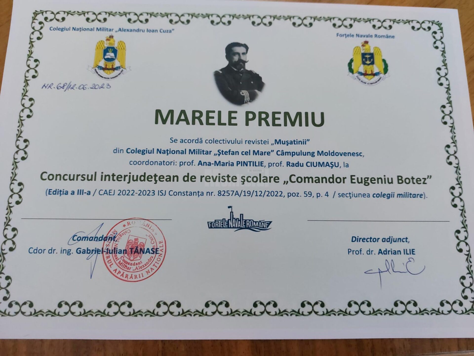Pentru al treilea an consecutiv, revista Colegiului Național Militar „Ștefan cel Mare” Câmpulung Moldovenesc, „Mușatinii”, a câștigat Marele Premiu la concursul de reviste școlare „Comandor Eugeniu Botez”, organizat de Colegiul Național Militar „Alexandru Ioan Cuza” din Constanța.