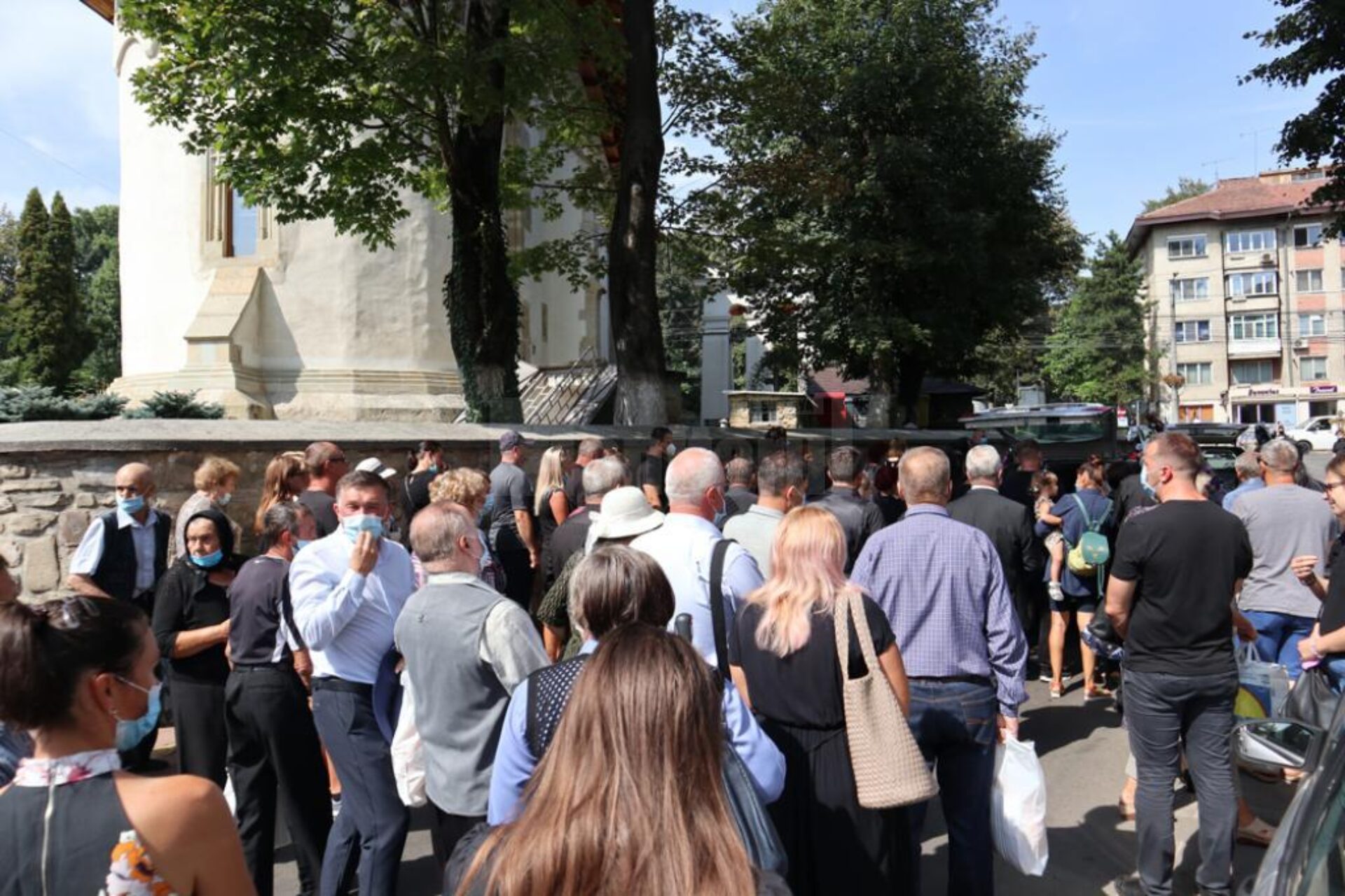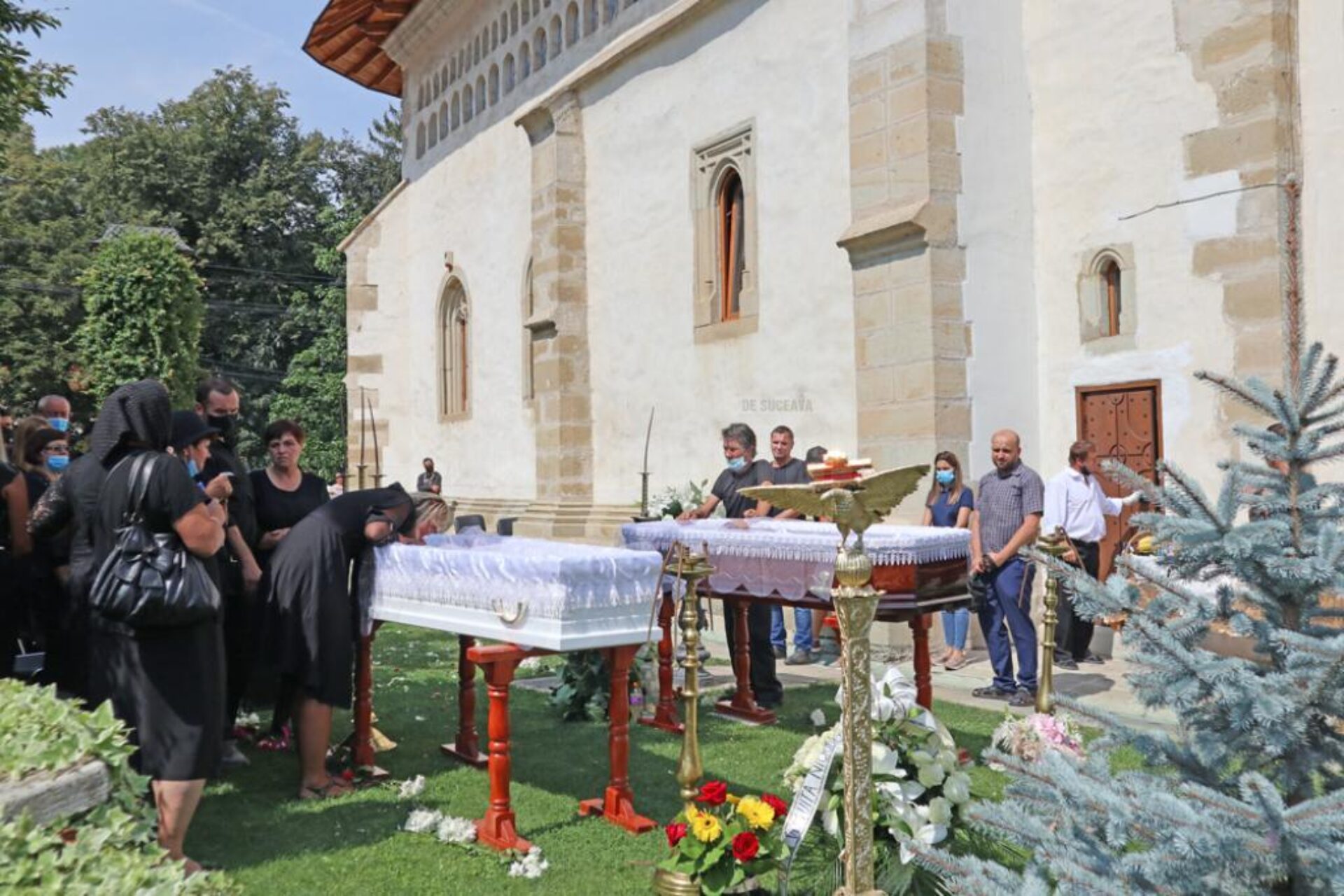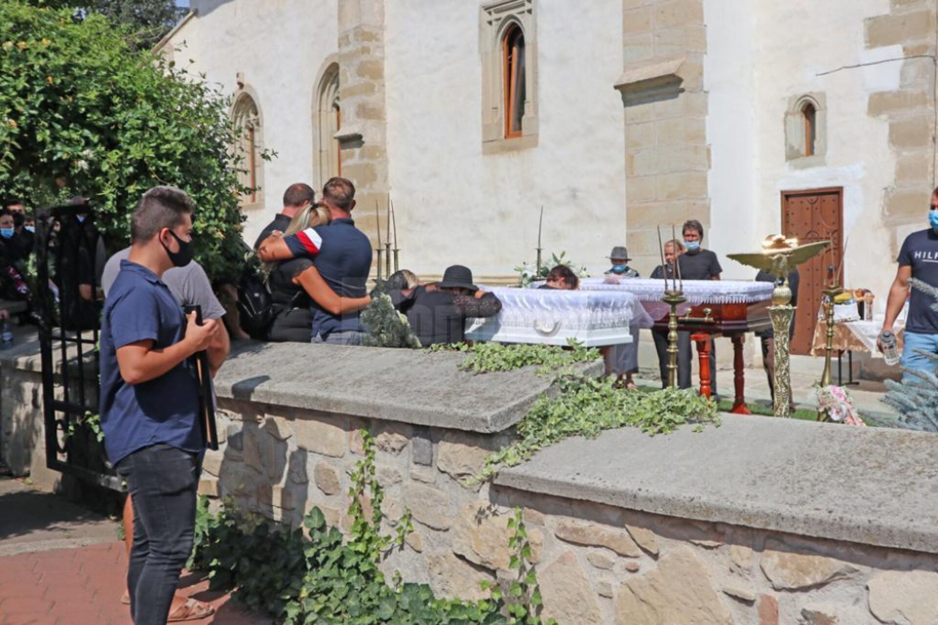În vreme ce sicriele celor doi au fost depuse în curtea bisericii, pe spațiul verde, alături fiindu-le membrii familiilor afectate de tragedie, restul participanților s-au răspândit pe spațiile din apropiere, păstrând distanța, pe cât posibil, dar și măștile de protecție.