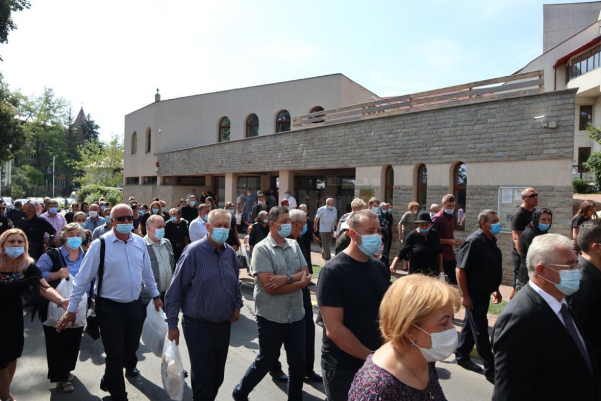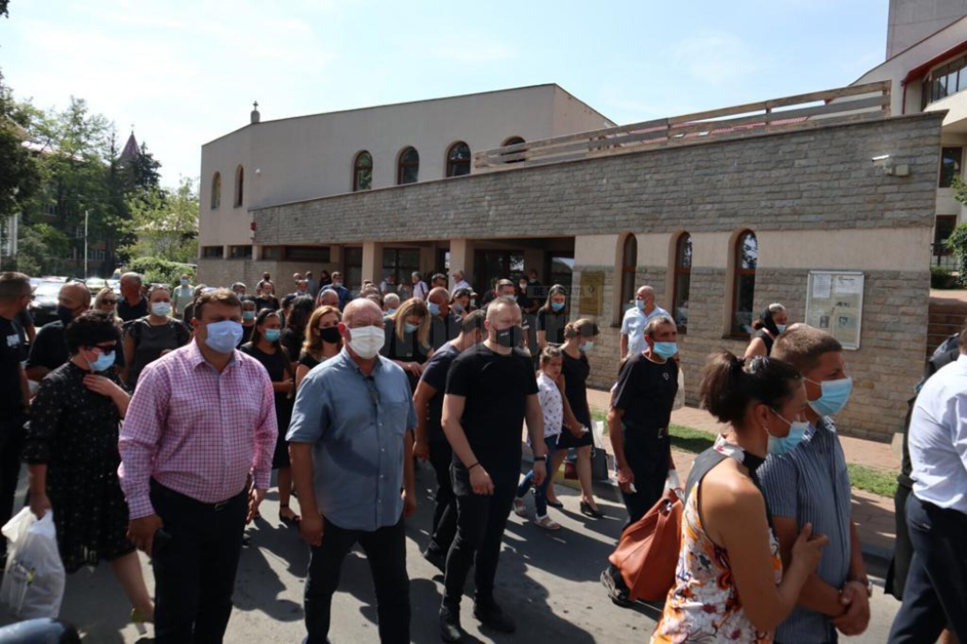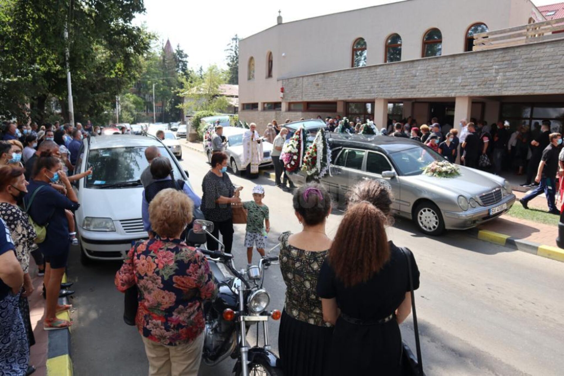 În vreme ce sicriele celor doi au fost depuse în curtea bisericii, pe spațiul verde, alături fiindu-le membrii familiilor afectate de tragedie, restul participanților s-au răspândit pe spațiile din apropiere, păstrând distanța, pe cât posibil, dar și măștile de protecție.