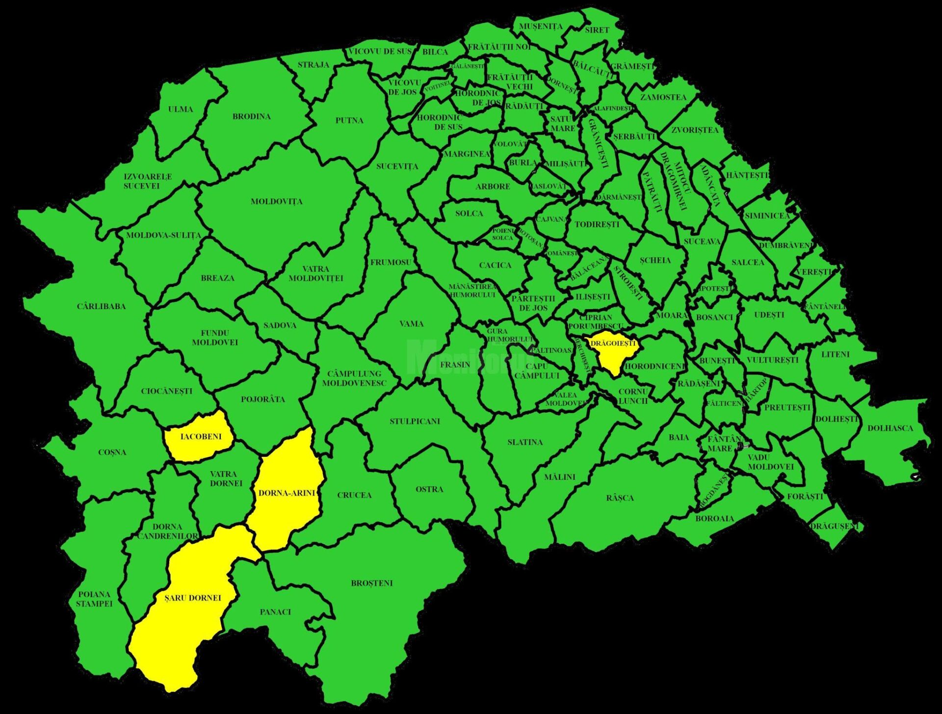 Județul Suceava nu mai are nici o localitate în zona roșie de incidență Covid, însă a crescut numărul de infectări zilnice, față de zilele anterioare. Marți s-au înregistrat 30 de cazuri noi de infectare și 18 persoane au fost reconfirmate pozitiv la retestare, din 1.387 persoane testate. Incidența este de 0,39 la mie, cu 278 de cazuri active. Din cele 114 localități din județ, 41 nu au nici un caz activ de Covid, 30 au câte un caz, 28 au sub cinci cazuri, 8 au sub zece cazuri iar 7 au peste zece cazuri active. În zona galbenă de incidență sunt comunele Dorna Arini, Drăgoiești, Iacobeni și Șaru Dornei.