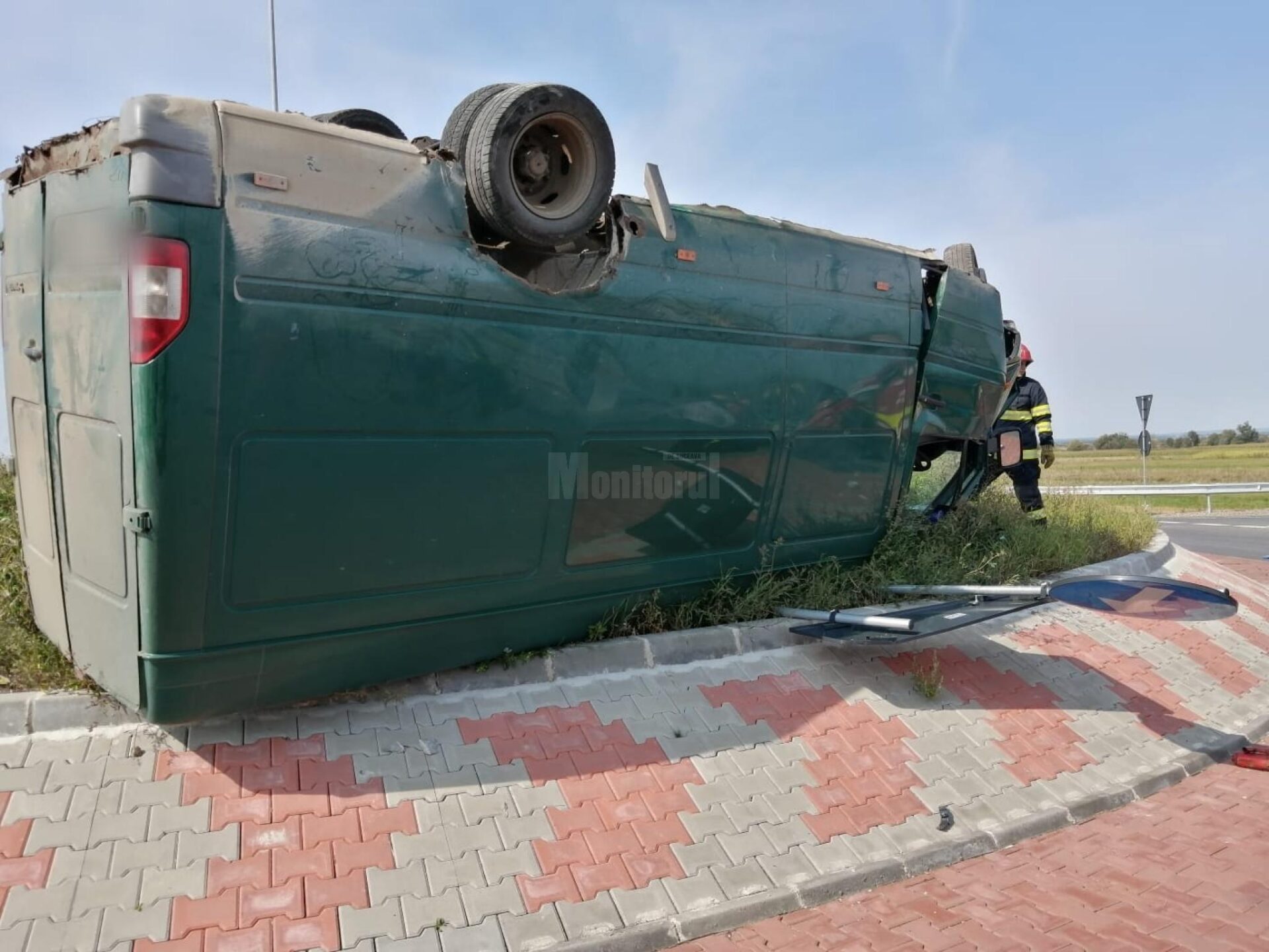O autoutilitară scăpată de sub control de șofer s-a răsturnat azi în sensul giratoriu, chiar peste amenajarea rutieră, pe centura municipiului Rădăuți, zona de ieșire spre Horodnic.